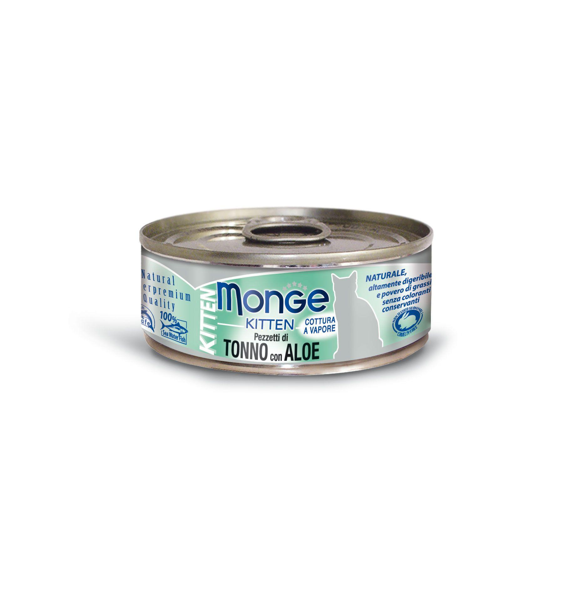 Monge Jelly Kitten Thunfisch & Aloe Vera 10x80g Monge Jelly Kitten mit Thunfisch und Aloe Vera ist ein Ergänzungsfuttermittel für Kätzchen, hergestellt in Thailand. Monge Jelly erfüllt alle Anforderungen an hochwertiges Futter, so dass Ihre Katze den intensiven Geschmack von frischen, hochwertigen Produkten lieben wird. Der hohe Nährstoff- und Proteingehalt versorgt Ihren Vierbeiner zudem mit allem, was er täglich braucht. Die enthaltenen Omega-3-Fettsäuren sorgen für eine gesunde Haut und ein glänzendes Fell und der geringe Fettgehalt sorgt dafür, dass das Idealgewicht Ihrer Katze erhalten bleibt. Auf diese Weise sorgen Monge dafür, dass sich sowohl Tiere als auch Menschen rundum wohlfühlen. Dieses Katzenfutter wird schonend gedämpft, um möglichst viele Inhaltsstoffe zu erhalten. Bei Monge werden keine Konservierungsstoffe oder künstliche Farbstoffe verwendet, damit die Ernährung Ihres Lieblings so natürlich wie möglich bleibt.