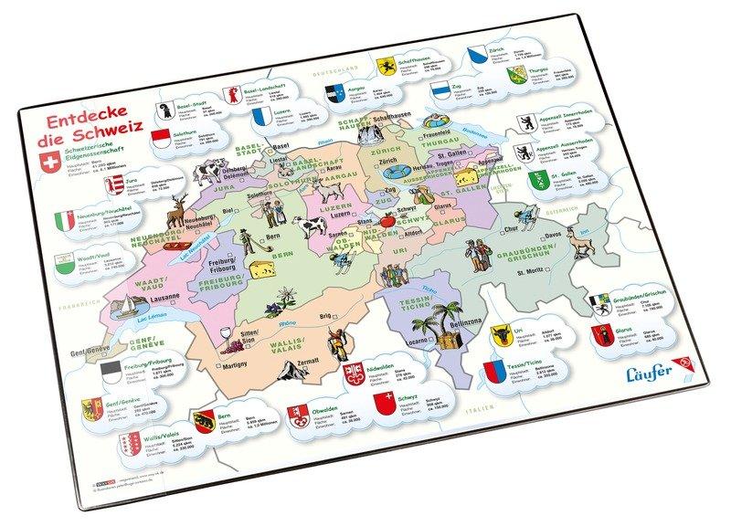 Schreibunterlage Diese rutschfeste Schreibunterlage von LÄUFER schützt den Schreibtisch und ist gleichzeitig kindgerecht gestaltet. Diese Unterlage mit der Schweizer Landkarte bietet Informationen zu den einzelnen Kantonen. Transparente Leiste auf der linken Seite zum Unterlegen von Notizen 3-Schichten-Aufbau Bietet Schreibkomfort Unempfindlich und langlebig