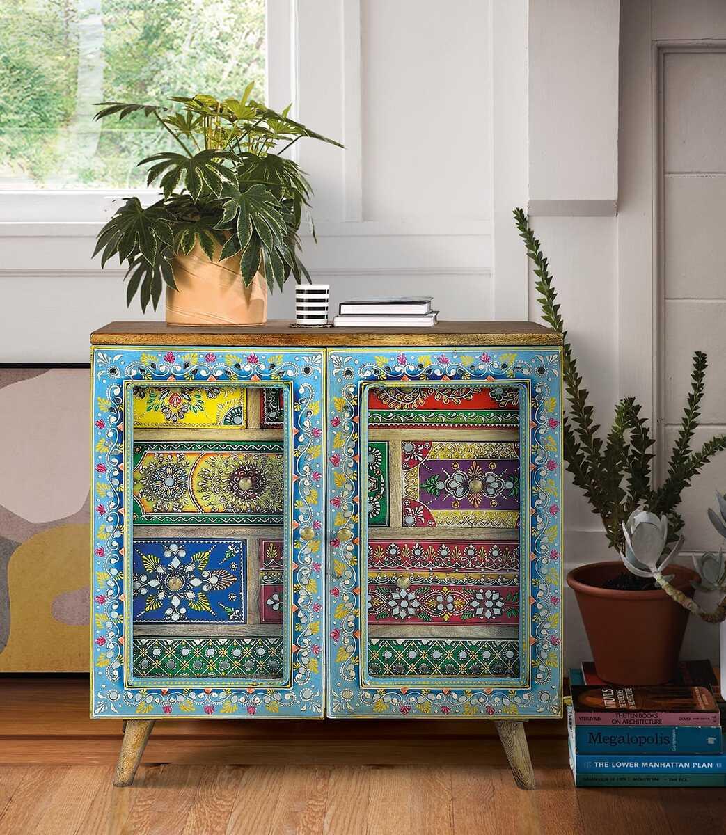 Material: Hochwertiges Mangoholz Farbe: Natürlich und Mehrfarbig Handbemaltes Design 7 geräumige Schubladen 2 robuste Türen Vielseitiger Stauraum Bringen Charme in jeden Raum