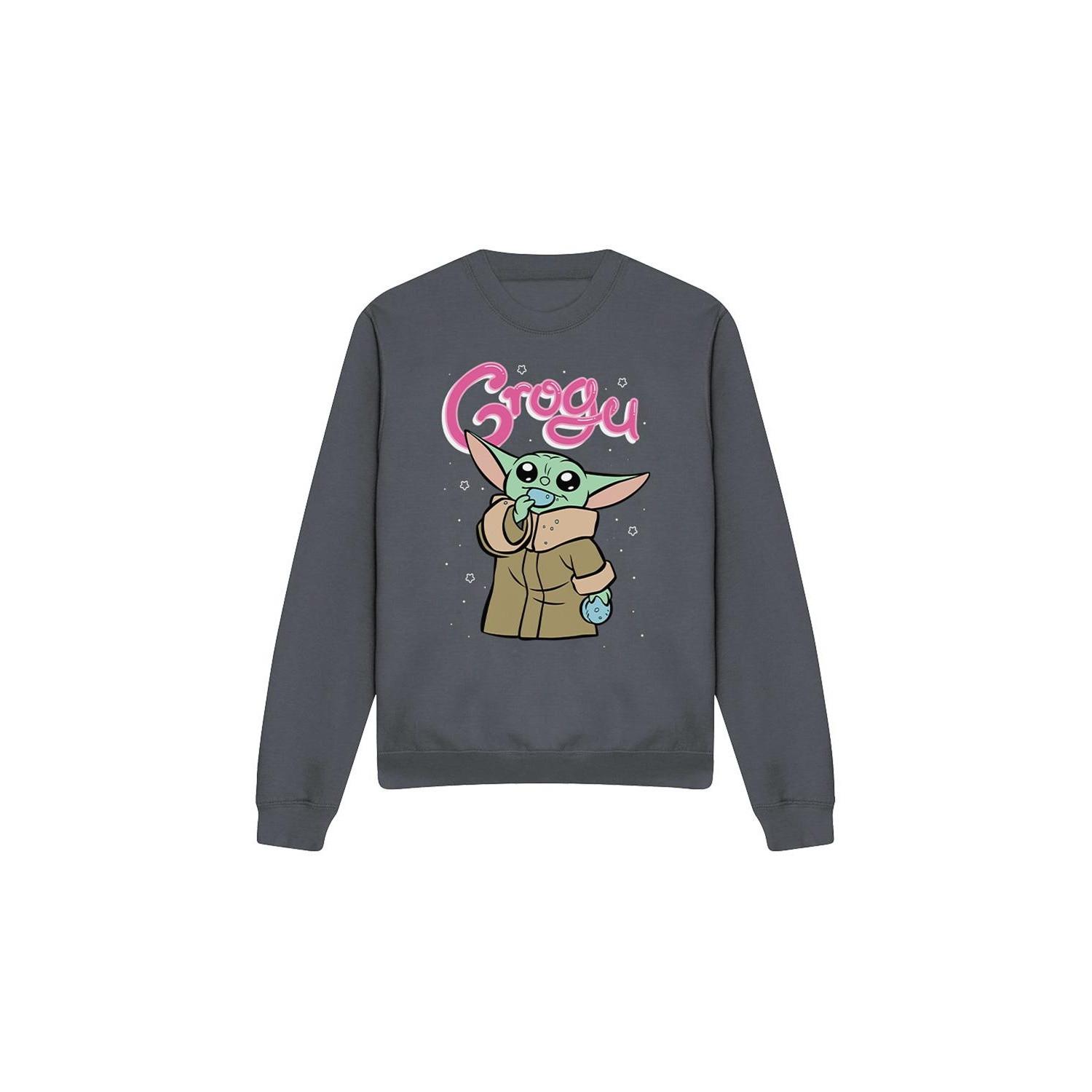 Dieses Rundhals-Sweatshirt zeigt eine verspielte Grafik von Grogu, auch bekannt als Baby Yoda, aus Star Wars. Das Design zeigt Grogu in seiner charakteristischen Robe, wie er einen Snack geniesst, mit dem Namen "Grogu" in einer stilisierten Schrift über ihm. Das dunkelgraue Sweatshirt bietet eine bequeme und vielseitige Option für Freizeitkleidung.
