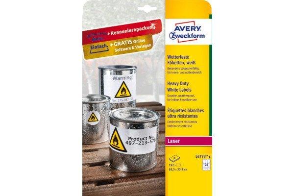 Die weissen, wetterfesten Etiketten L4773-8 im Format 63,5 x 33,9 mm für Laser-Drucker von AVERY ZWECKFORM zeichnen sich durch eine extreme Strapazierfähigkeit im Innen- und Aussenbereich aus. 192 matt beschichtete Folien-Etiketten aus Polyester auf 8 Bogen. Durch die starke, permanente Haftung eignen sie sich besonders zur wetterfesten und dauerhaften Kennzeichnung. Die reiss- und wasserfesten Folien-Etiketten sind deutlich strapazierfähiger als Papier-Etiketten, öl-, schmutz-, UV- und temperaturbeständig (-20° bis +80°C), seewasserfest und abwaschbar.Gestalten und drucken Sie Ihre wetterfesten Aufkleber schnell und einfach - mit den kostenlosen Avery Zweckform Etiketten-Vorlagen oder den im Microsoft® Office Paket integrierten Basis-Vorlagen. Geeignet für alle gängigen Laser-Drucker.Das klimaneutrale Unternehmen Avery Zweckform verwendet schon seit 2014 ausschliesslich Ökostrom/-gas. Forschung, Entwicklung, Produktion, Logistik und Verwaltung am Firmenstandort in Oberlaindern/Bayern garantieren höchste Qualitätsstandards, hohe Umweltvorgaben und kurze Lieferwege. Die Etiketten aus PVC-freier Folie werden klimaneutral hergestellt, die Emissionen des Materials werden kompensiert.