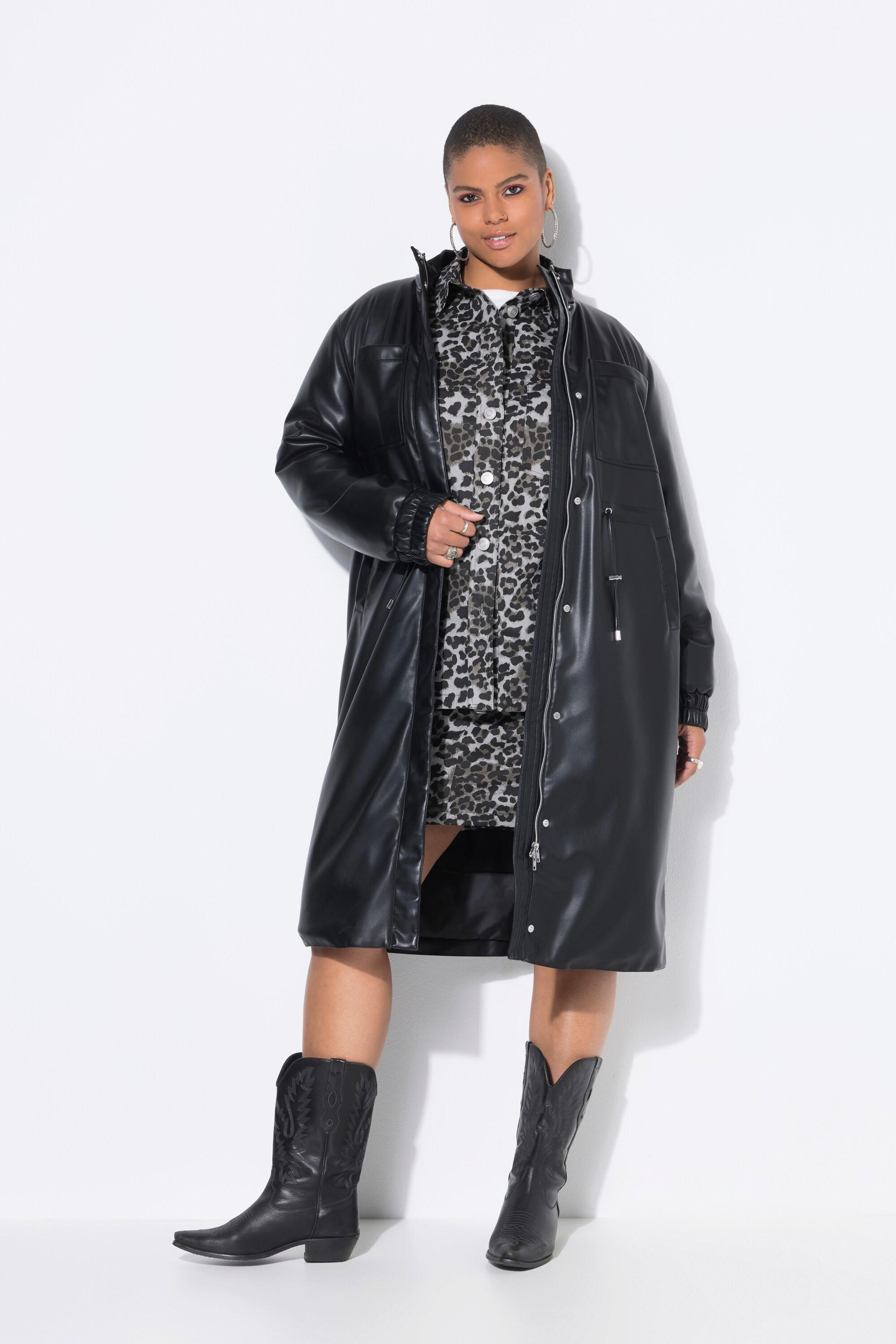 Dieser Mantel präsentiert sich in einer stilvollen Lederoptik, die eine moderne und ausgefallene Ästhetik bietet. Er ist mit einem praktischen Taillen-Tunnelzug ausgestattet, der eine verstellbare Passform und eine schmeichelhafte Silhouette ermöglicht. Der Mantel verbindet Mode mit Funktionalität und ist eine vielseitige Ergänzung für jede Garderobe.