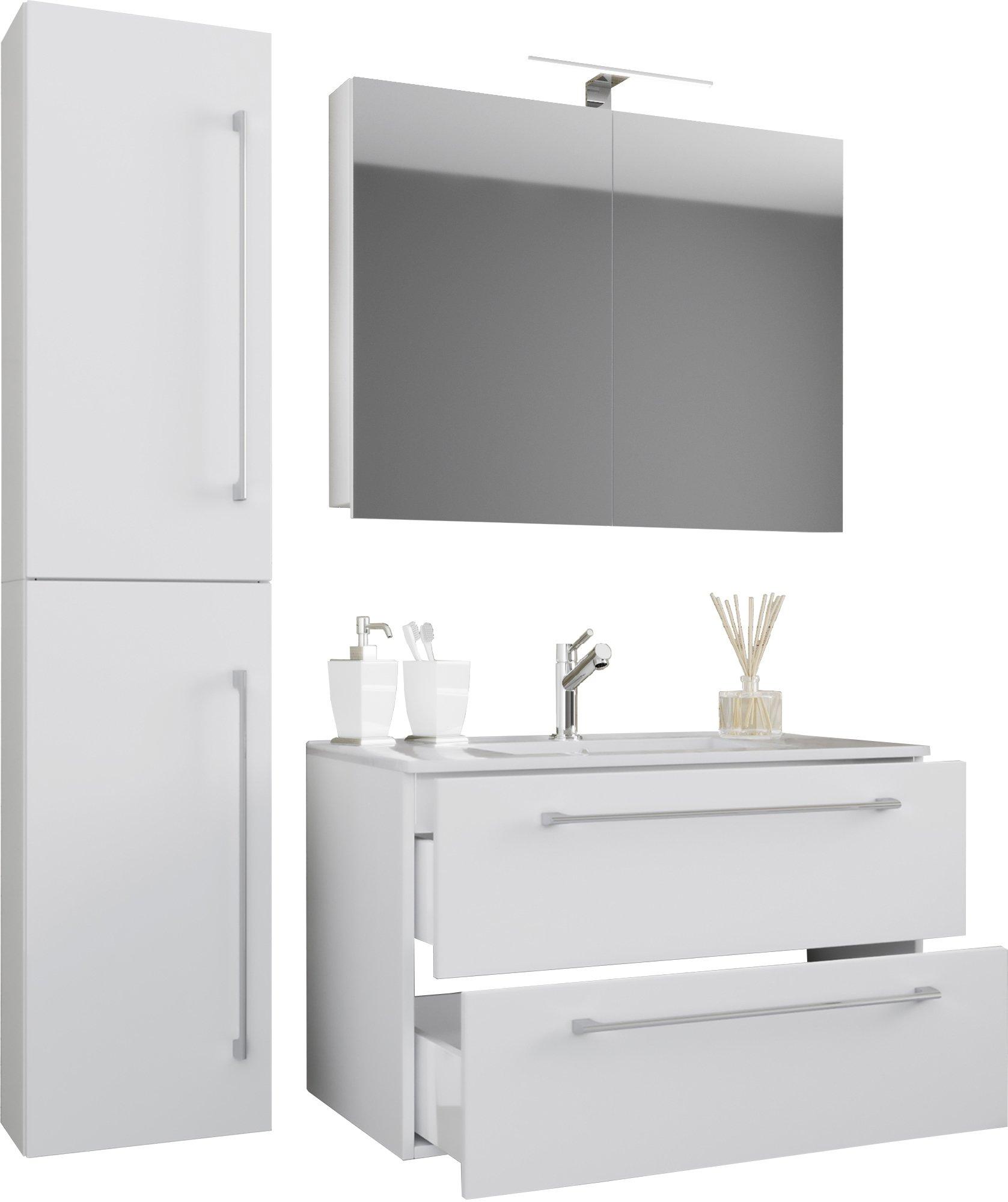 Das Badmöbel-Set "Badinos" besteht aus einem Unterschrank mit zwei Schubladen auf robusten Metallschienen, einem Hochschrank und einem Spiegelschrank aus ESG-Sicherheitsglas. Das moderne Waschbecken aus massiver Keramik dient als Blickfang und verleiht Ihrem Badezimmer ein ganz besonderes Ambiente.