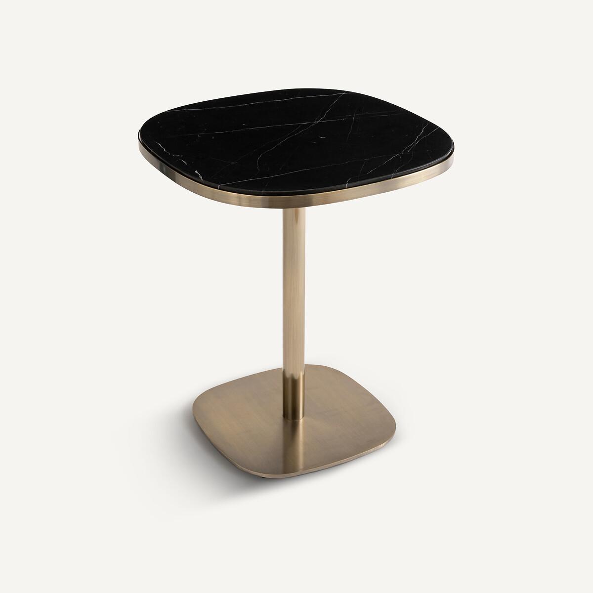 Der ikonische Bistro-Tisch, neu interpretiert. Seine abgerundete Marmorplatte harmoniert wunderbar mit dem Fuss aus altmessingfarbenem Metall.