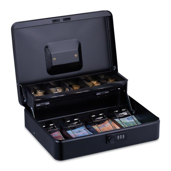 Kleine Geldkassette für Münzen und ScheineWenn Sie Bargeld sicher aufbewahren möchten, ist diese Geldkassette die richtige Wahl. Die Geldschublade eignet sich sowohl für den Einsatz zu Hause als auch auf Flohmärkten, Messen und anderen Veranstaltungen. Münzen können Sie in den 5 Münzfächern und Banknoten in den 4 Geldscheinfächern nach Wert sortieren, sodass Sie stets den Überblick behalten. Die Geldschublade ist mit einer 3-stelligen Zahlenkombination gesichert und lässt sich am Tragegriff bequem transportieren.