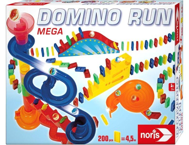 Stellen Sie mit den 200 Dominosteinen und dem umfangreichen Zubehör einen faszinierenden Parcours auf. Starten Sie den Lauf mit der Kugelbahn, indem eine der sechs Murmeln die Bahn hinunterrollt und den ersten Stein anstösst. Die Steine überwinden zahlreiche Hindernisse, darunter Treppen und Hügel. Im Trichter wird eine Murmel angestossen, die in immer kleiner werdenden Kreisen die nächsten Steine des Parcours anstösst. Für Kinder ab 3 Jahren geeignet.
