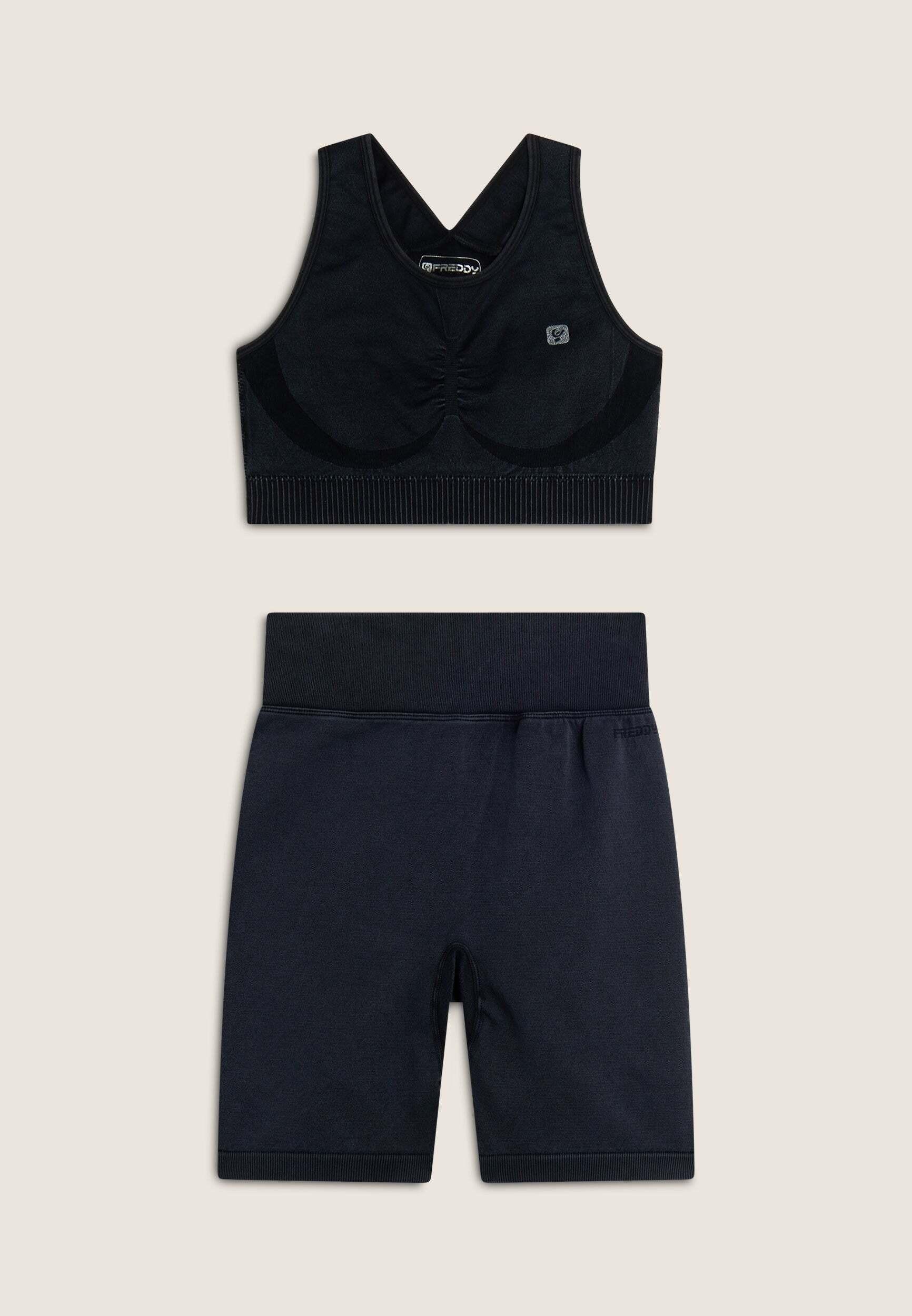 Dieses Outfit aus Top und Biker-Leggings kombiniert Stil und Technik. Es wurde für maximalen Halt und Komfort mit minimalen Nähten entwickelt und besteht aus Stretch-Polyamid, einem Stoff, der zu 60 % aus recycelten Materialien besteht. Die Ice-Wash-Färbung verleiht ihm ein unverwechselbares, kerniges Aussehen. Das Oberteil hat einen Rundhalsausschnitt und einen Rücken mit überkreuzten Trägern für optimale Bewegungsfreiheit. Das Unterbrustband und die vorgeformten Cups bieten Stabilität und Komfort, wenn du dich bewegst. Die Radlerhose haben einen sehr hohen Bund und gerippte Einsätze am Gesäss, die Halt bieten und die Kurven betonen.