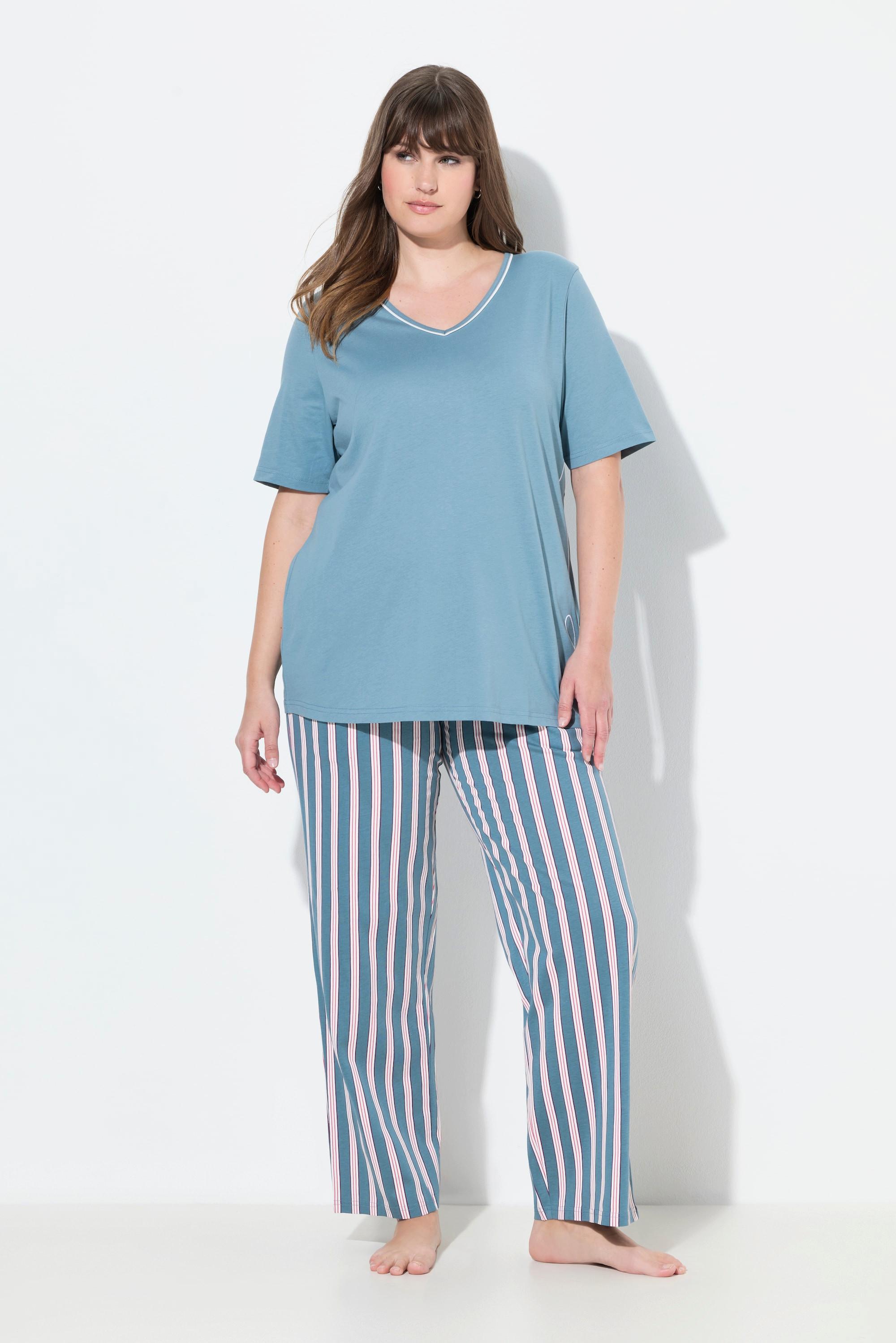 Dieser zweiteilige Pyjama verfügt über farbiges Piping. Das einfarbige Shirt hat einen V-Ausschnitt und Halbarm, mit einer kleinen Stickerei am Saum. Das Set beinhaltet eine lange, gerade Hose mit Streifendruck, einen Elastikbund und seitliche Taschen.