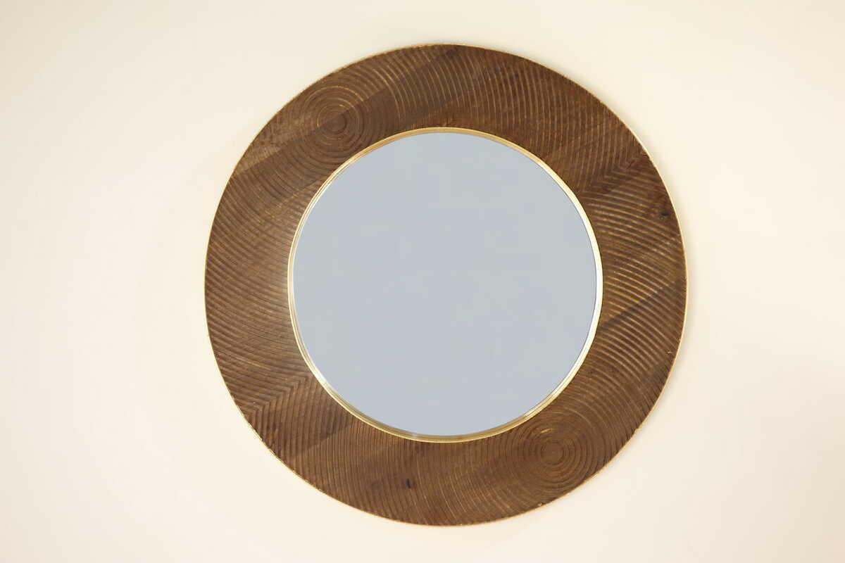 Der Wandspiegel "Rondo" besticht durch seine Messingkanten und seine grosszügigen Masse von 90x4x90 cm.