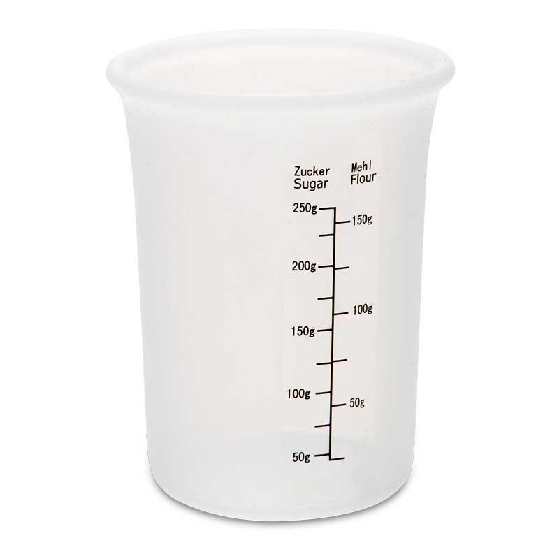 Der Messbecher aus Silikon ist ein praktischer Helfer für jede Küche. Die abgemessenen Zutaten können gleich im Messbecher gemixt, püriert und auch gebacken werden, da der Becher gefrier- und hitzebeständig ist. Füllmenge : 250 ml Material : Lebensmittelechter Silikon Grösse : Ø 8.5 cm / Höhe: 11 cm Geeignet für : Backofen, Pürierstab, Mixer Anwendungshinweis : Für Mikrowellen geeignet Pflegehinweise : Spülmaschinengeeignet Hinweis : Temperaturbeständig von -30 °C bis +230 °C