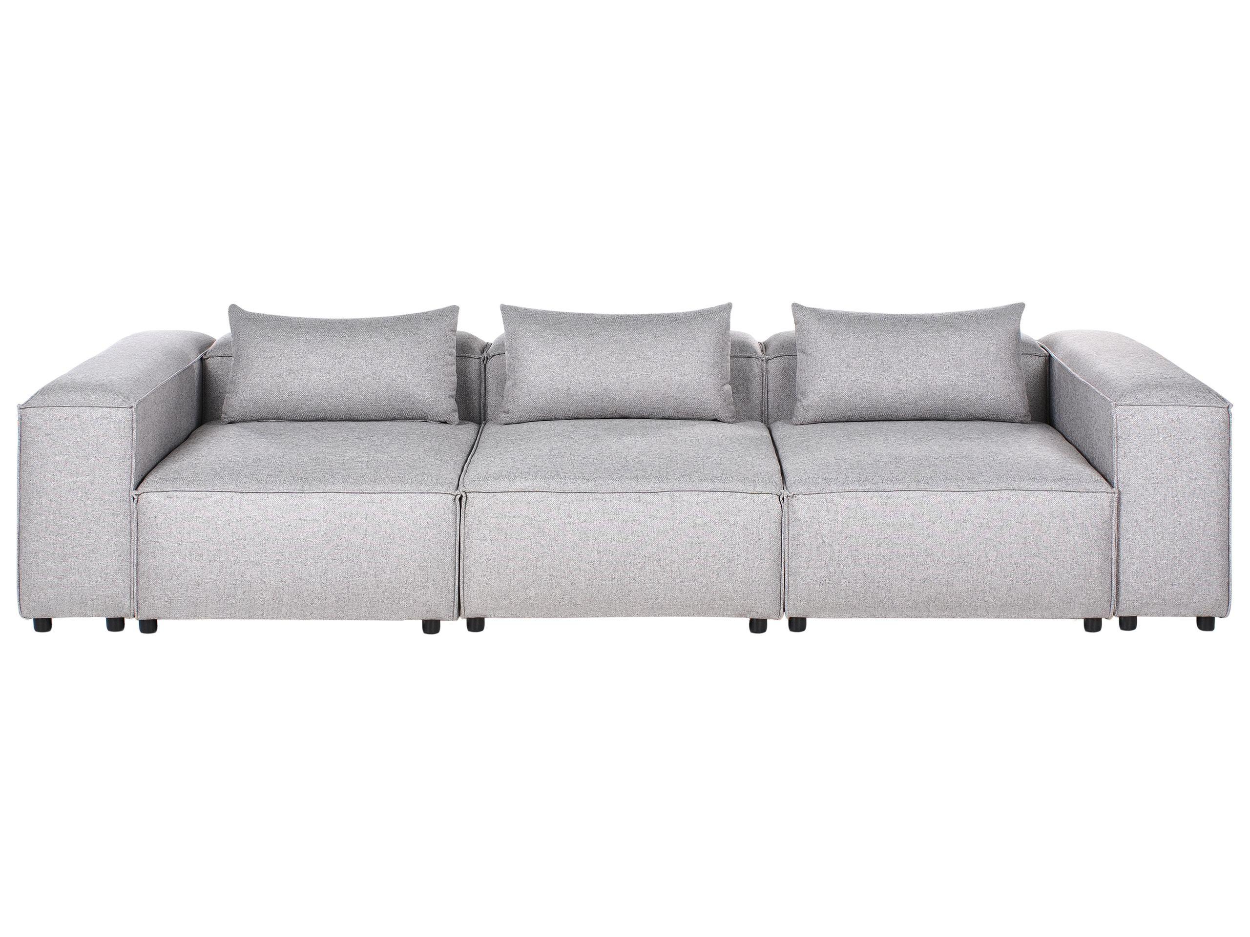 Modernes, modulares Dreisitzer Sofa mit drei Dekokissen. Dieses Polstersofa zeichnet sich durch seine flexible Bauweise aus: Es lässt sich auf drei einzelne, freistehende Module aufteilen oder mit zusätzlichen Modulen erweitern – perfekt für dynamische Wohnkonzepte und -situationen. Der Stoffbezug ist mit auffälligen Ziernähten vollendet, die für eine moderne, hochwertige Optik sorgen und auch die klare Linienführung des Sofas unterstreichen. Dank der dicken Polsterung und niedrigen Sitzhöhe entsteht eine Lounge-Atmosphäre, die perfekt zu modernen Wohnräumen passt. Die Dekokissen mit abnehmbaren Bezügen bilden ein weiteres praktisches Extra.
