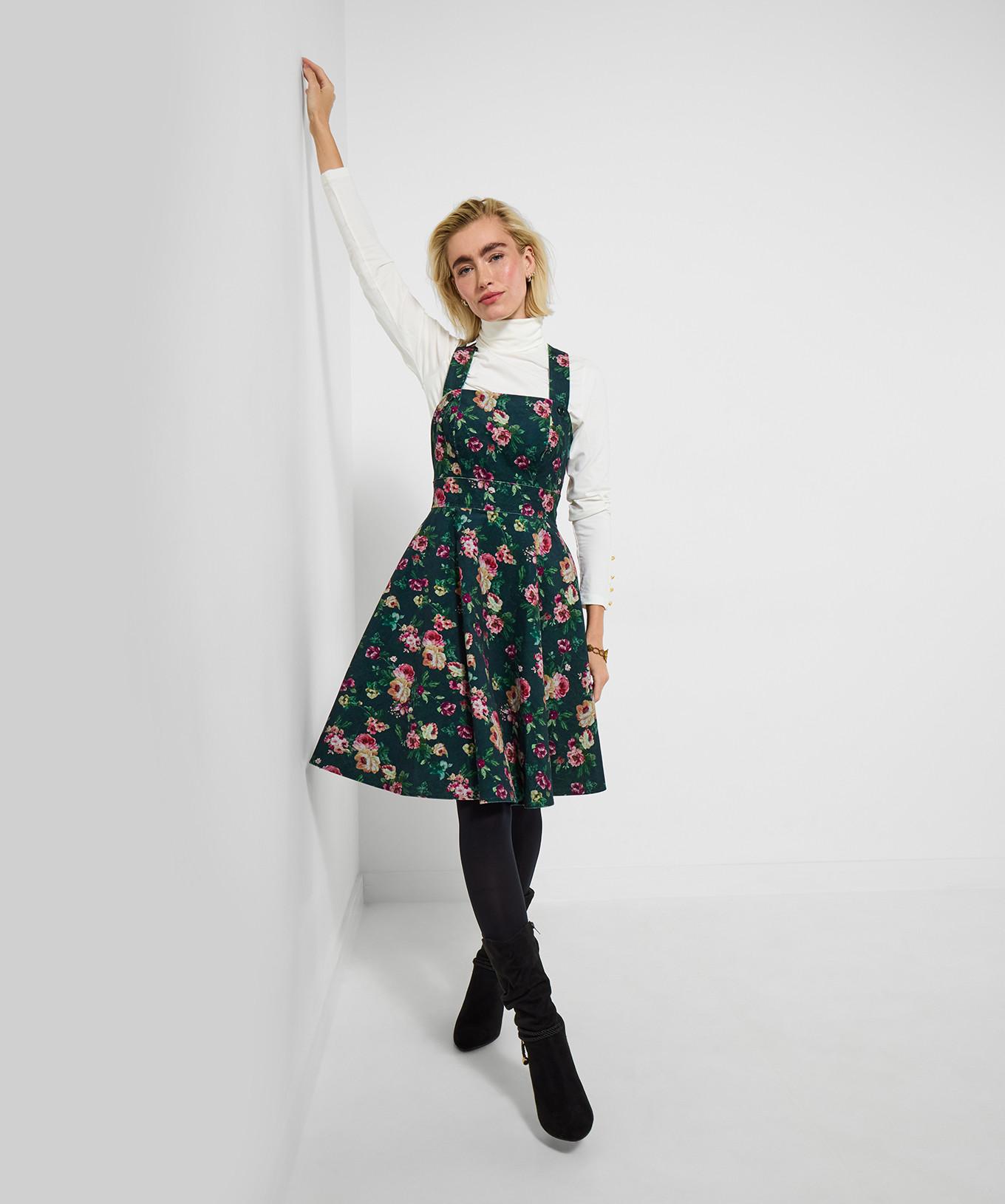 Dieses Latzkleid mit charmantem Blumenmuster ist eine entzückende und vielseitige Ergänzung für jede Garderobe. Das Design umfasst ein tailliertes Oberteil und einen ausgestellten Rock, der eine klassische Silhouette schafft. Es ist perfekt zum Layern.