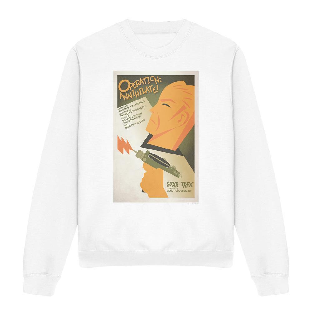 Dieses Sweatshirt zeigt einen auffälligen Grafikdruck, inspiriert von "Operation: Annihilate!", Episode 29 von Star Trek: The Original Series. Das Design fängt die Retro-Ästhetik klassischer Science-Fiction-Poster ein und macht es zu einem unverwechselbaren Stück für Fans.