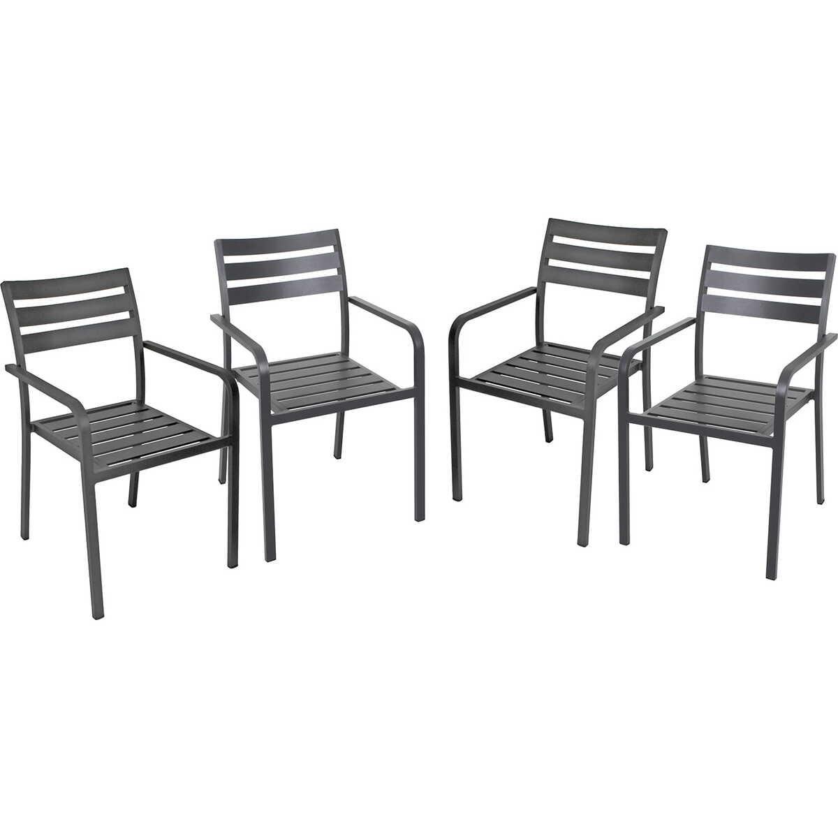 Elegante Anthrazit-Pulverbeschichtung für modernes Design Hochwertiges Aluminium-Gestell für Robustheit und Langlebigkeit Stapelbares Design für platzsparende Lagerung Vielseitig einsetzbar in verschiedenen Räumen und Umgebungen Set bestehend aus vier Stühlen Rückenlehnenhöhe von 45 cm für optimalen Komfort Maximale Belastbarkeit von 110 kg