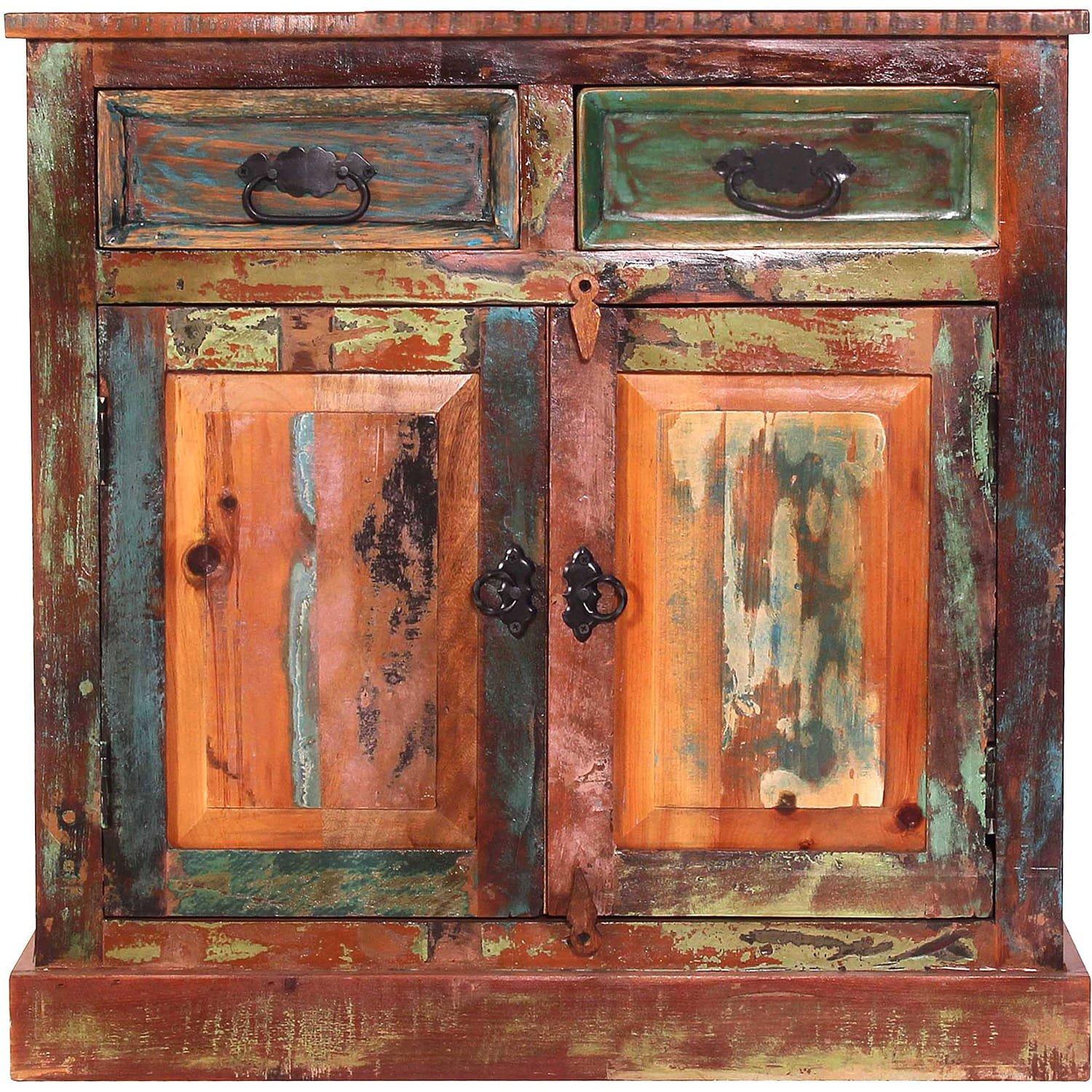 Beschreibung:Diese Kommode gefertigt aus buntem Altholz im Shabby Chic, ist ein wahrer Eyecatcher. Sie ist dank ihrer Kombinationsmöglichkeit mit schon vorhandenem Mobiliar vielseitig einsetzbar. Das Schränkchen bietet genügend Platz in 2 Schubkästen und hinter 2 blickdichten Türen mit je einem festen Einlegeboden für die privaten Dinge des Lebens. Die Deckplatte eignet sich auch für grössere Vasen oder Schalen. In Flur als zusätzlicher Garderobenschrank bietet er viel Stauraum. Das Holz aus recycelten Fischerbooten gibt dem Kommodenschrank einen zusätzlichen Reiz. Die Kommode kann sowohl in einem Wohnraum oder Esszimmer mit modernem Mobiliar kombiniert werden als auch in einer Diele als Garderobenschrank ihren Charme zum Ausdruck bringen. Fernab von unserer oft langweiligen Perfektion, ist dieses Möbel ein echtes Unikat.Aufbau: 2 Türen, 2 SchubladenZusatzinformationen: 1 Boden