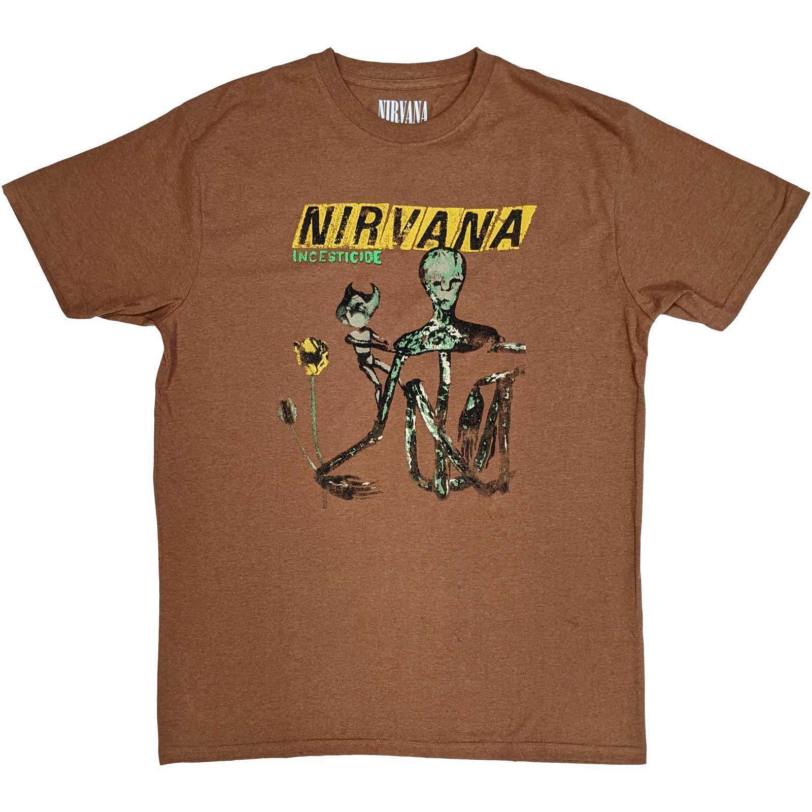 Dieses T-Shirt verfügt über einen klassischen Rundhalsausschnitt und kurze Ärmel und bietet eine bequeme und vielseitige Passform. Die Vorderseite ist mit einem markanten Grafikdruck versehen, der vom Nirvana-Album "Incesticide" inspiriert ist und einzigartige Kunstwerke zeigt, die die Essenz des ikonischen Stils der Band einfangen. Das Design umfasst den Bandnamen, der prominent über dem Albumtitel angezeigt wird, und eine surreale, künstlerische Illustration.