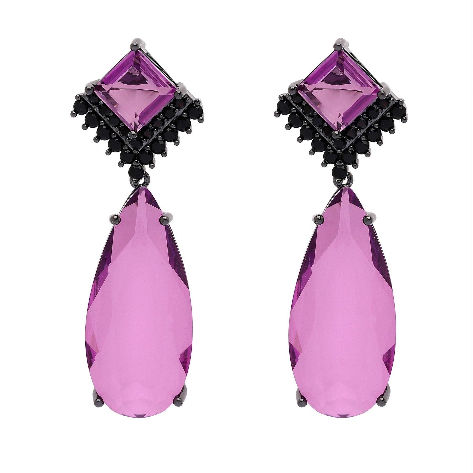 Diese wunderschönen violetten Ohrringe bestechen durch ihre markanten, tropfenförmigen Edelsteine in einem tiefen, satten Farbton. Die filigranen schwarzen Perlen um die quadratisch geschliffenen Steine bilden einen eleganten Kontrast und machen die Ohrringe zu einem ausdrucksstarken Schmuckstück für jeden besonderen Anlass. Größe: 1,8 cm x 5,0 cm | Beschichtung: Rhodiumplattiert | Verschluss: Stecker und Rückseite