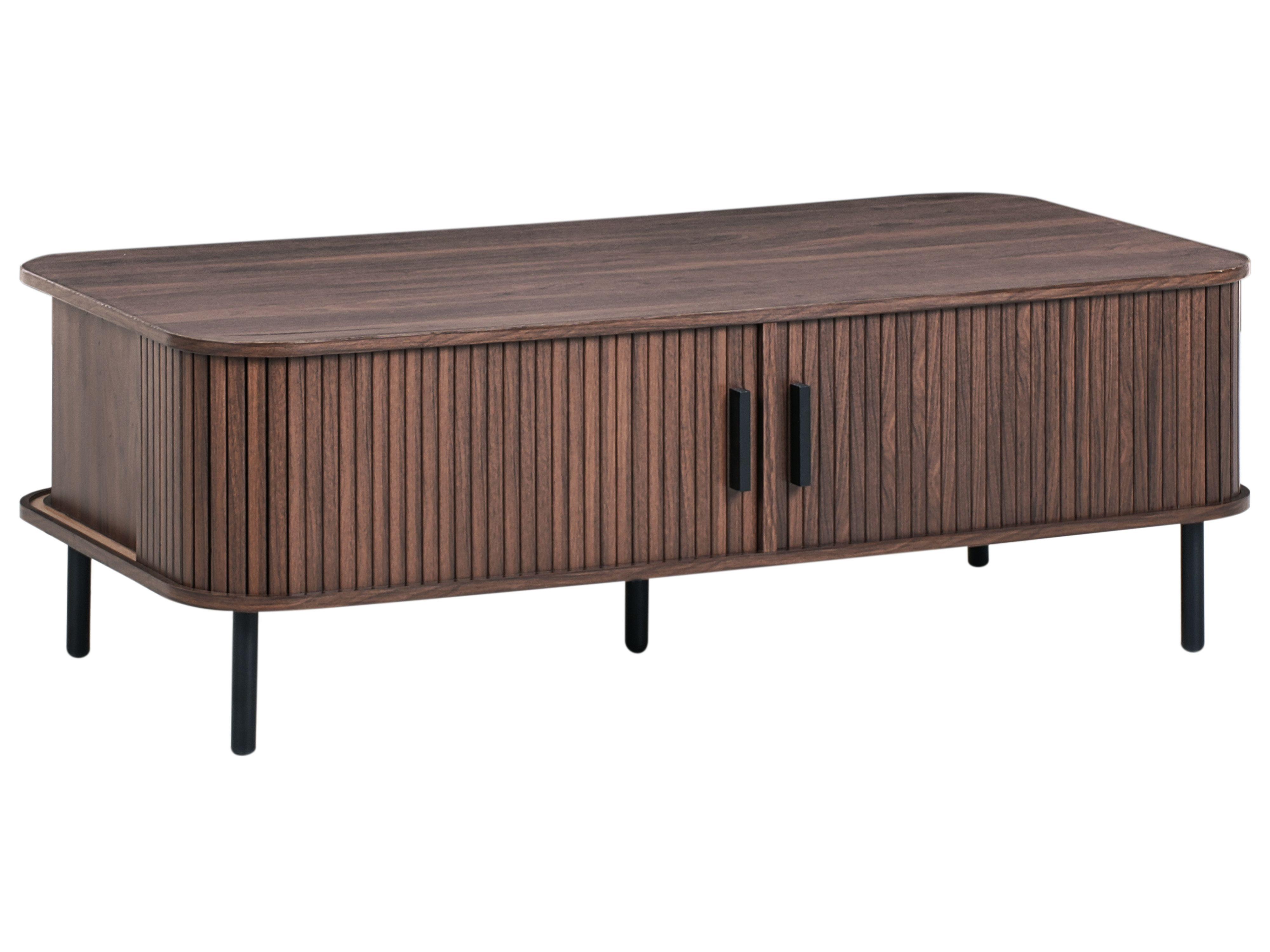 Couchtisch im Retro-Stil mit Schiebetür. Dekorieren Sie Ihr Wohnbereich mit diesem Couchtisch und organisieren Sie den Raum mit seinem Design. Dieses schicke Möbelstück verfügt über zwei elegante Schiebetüren, hinter denen sich geräumige Ablageflächen für Bücher, Kerzen und andere Wohnaccessoires verbergen. Das Retro-Design in Kombination mit dem dunklen Farbton und den schwarzen Beinen setzt Akzente und passt zu vielen Einrichtungsstilen. Die hochwertigen Materialien - MDF für den Korpus und Kiefernholz für die Griffe - garantieren nicht nur eine einfache Pflege, sondern auch eine lange Lebensdauer und machen das Möbelstück zu einer praktischen und stilvollen Ergänzung für Ihr Zuhause.