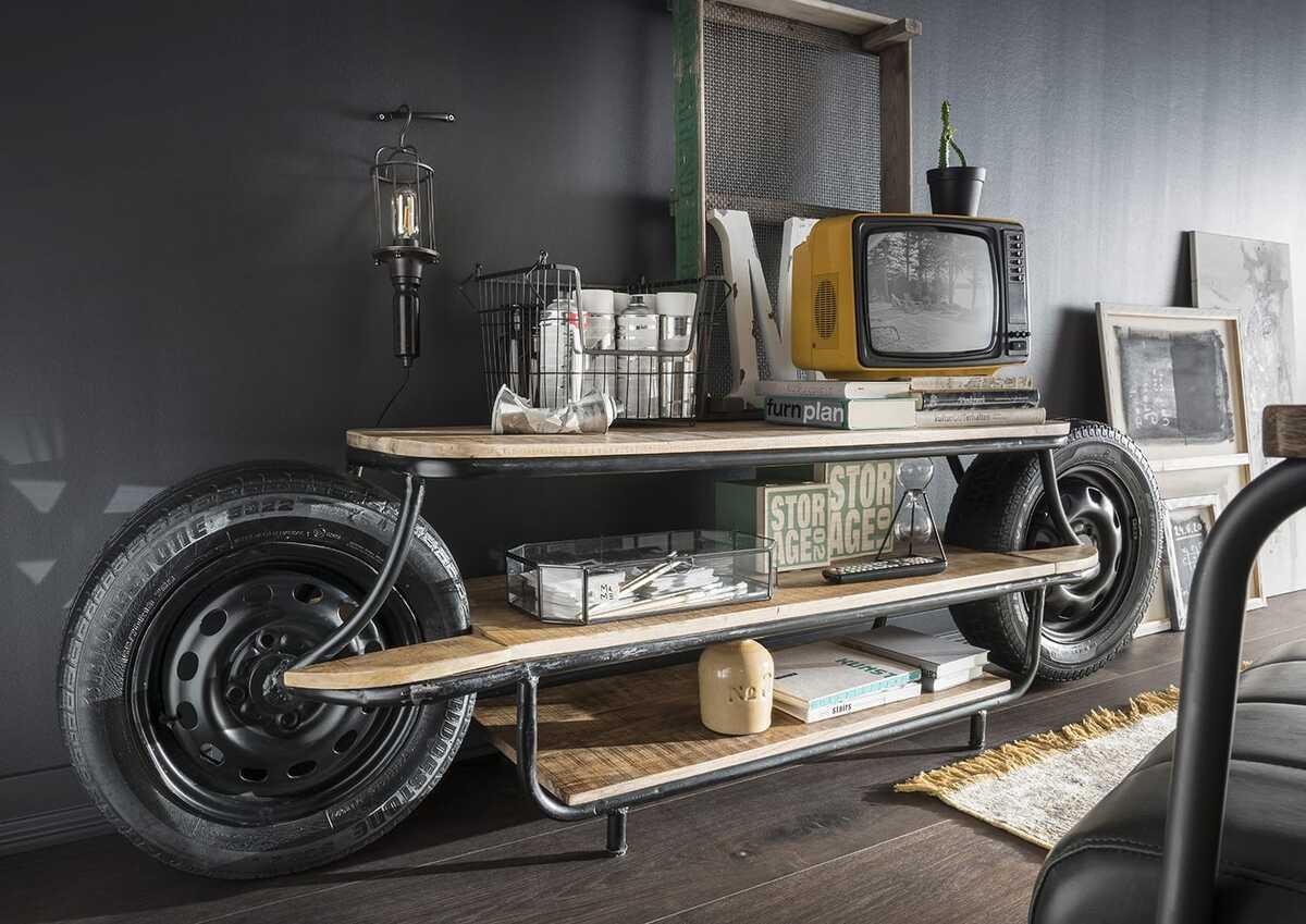 TV-Board Roadtrip mit 2 Rädern Metall Vintage schwarz 3 Holzböden Mango massiv (Breite x Höhe x Tiefe) ca. 210x55x40cm