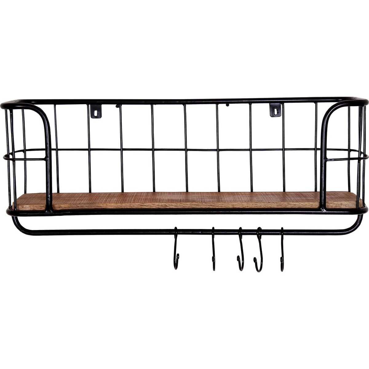 Wandregal aus Metall und recyceltem Mangoholz mit 1 Boden und 4 Haken, schwarz, Böden natur, 75x20x30
