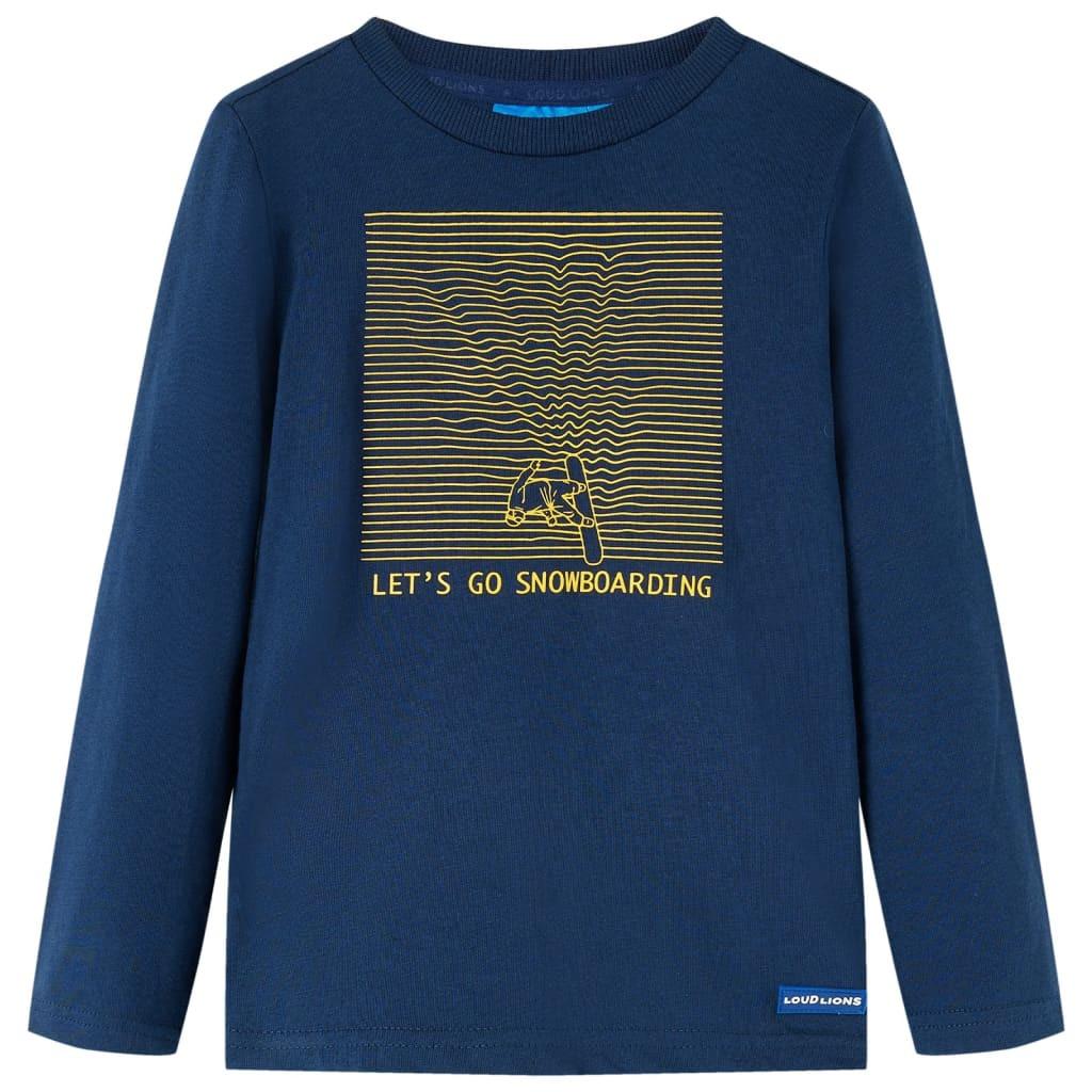 Dieses Kinder-T-Shirt hat lange Ärmel, einen Rundhalsausschnitt und eine gerade Passform. Dieses T-Shirt in Marineblau ist mit einem Mann auf einem Snowboard bedruckt. Das Langarmshirt besteht zu 100 % aus Baumwolle und fühlt sich daher sehr weich und angenehm an.