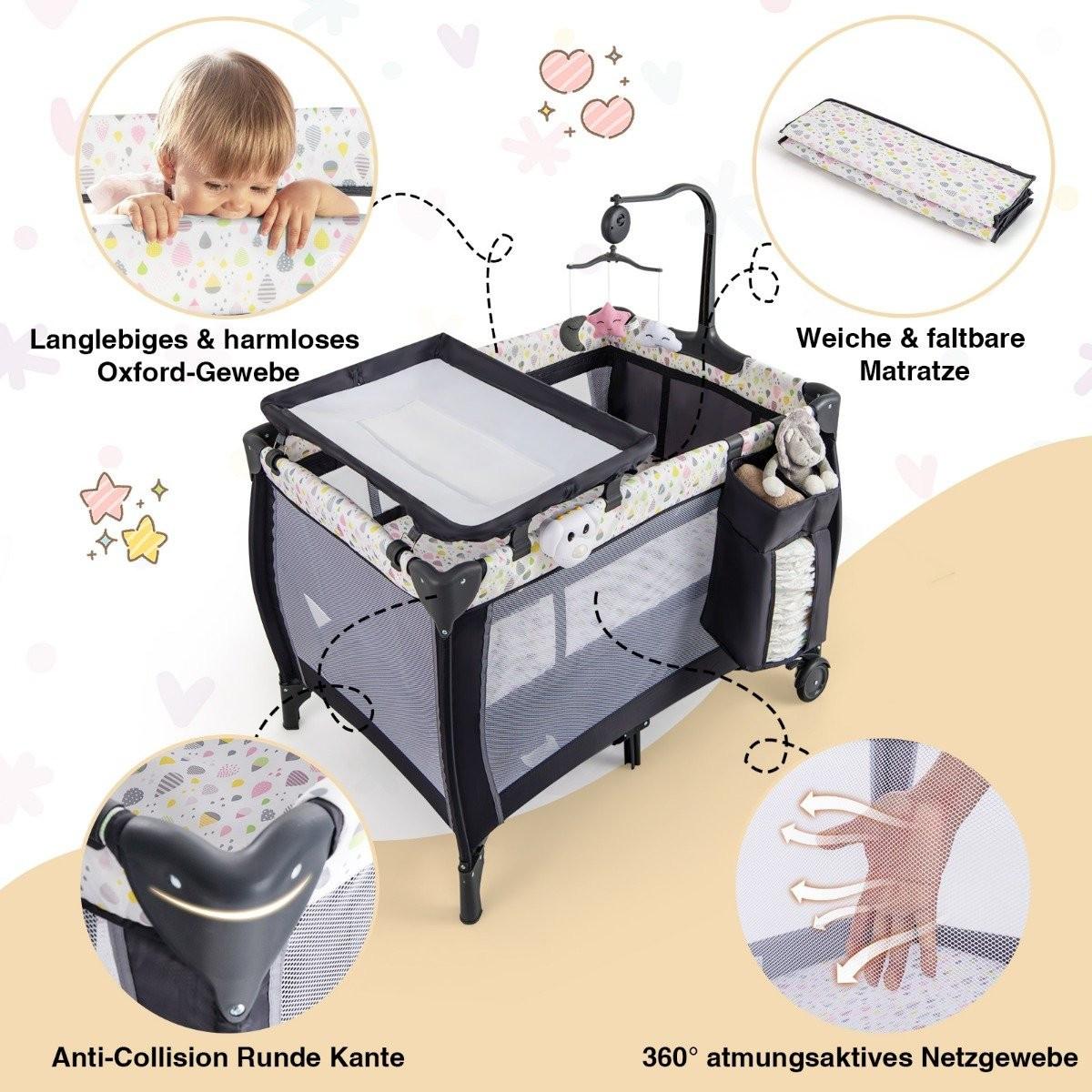 Mit seinem schnellen, werkzeuglosen Aufbau und seiner hohen Tragbarkeit ist dieses multifunktionale Baby-Reisebett der perfekte Begleiter für Eltern, die viel unterwegs sind. Die mitgelieferte Tragetasche sorgt für einen einfachen Transport, während die feststellbaren Räder für einfache Mobilität sorgen. Ausgestattet mit niedlichen Hängespielzeugen und einem Musik-Mobile erfüllt dieses Reisebett nicht nur die Bedürfnisse Ihres Kindes, sondern sorgt auch für Unterhaltung und Beschäftigung.