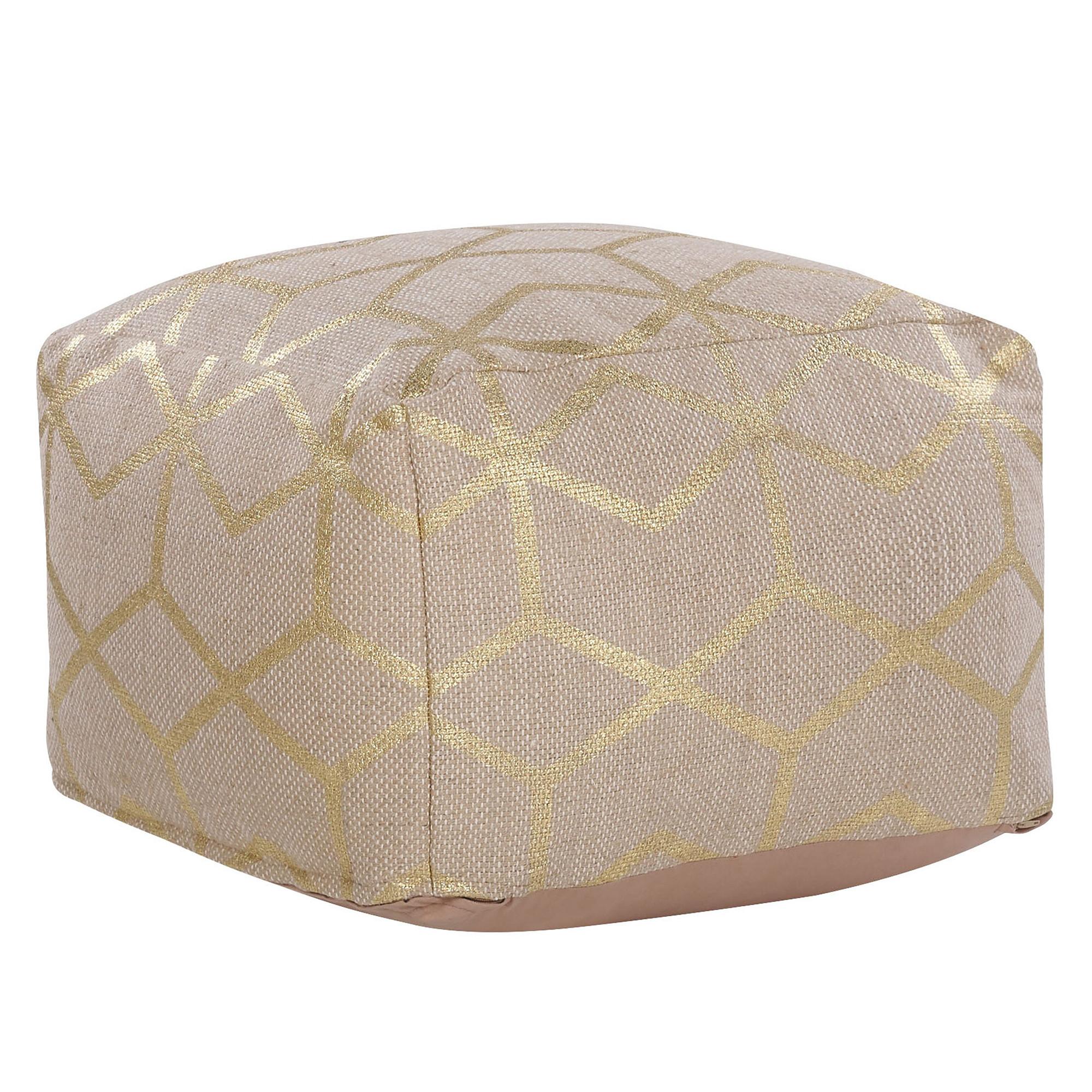 Moderner Pouf mit dekorativen Goldverzierungen. Solide Ausfertigung, bequeme Sitzfläche und wunderschöne Verzierungen - dieser Pouf besitzt alles, was das Herz begehrt. Kombinieren Sie dieses Accessoire mit anderen naturbelassenen Einrichtungselementen und erschaffen Sie eine trendige Wohnoase im Boho-Stil. Der hochwertige Jutestoff in Beige korrespondiert ausgezeichnet mit den goldenen Verzierungen und verleiht dem Pouf einen dekorativen und ethnischen Touch. Durch die Füllung mit kleinen und zahlreichen Styroporkügelchen passt sich die Sitzfläche an alle Formen und Sitzpositionen perfekt an.
