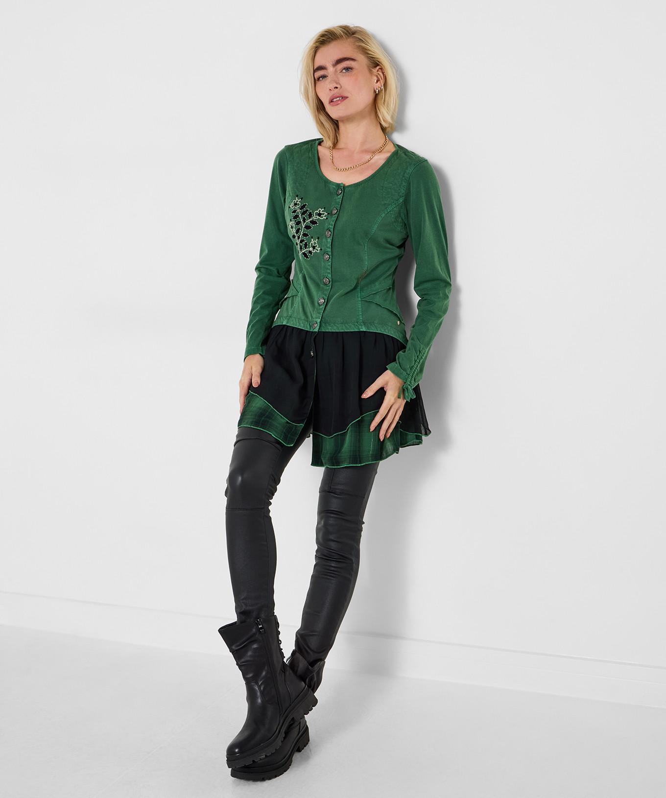 Diese Winter-Tunika verfügt über eine charmante Blumenstickerei, die dem Design einen Hauch von Eleganz verleiht. Die Tunika ist mit einem Rundhalsausschnitt und einer durchgehenden Knopfleiste für einfaches Anziehen ausgestattet. Die langen Ärmel sind mit dekorativen Bändern an den Manschetten verziert, was ihren einzigartigen Stil unterstreicht. Der gestufte Saum schafft eine dynamische Silhouette und macht diese Tunika zu einer vielseitigen Ergänzung für jede Garderobe.