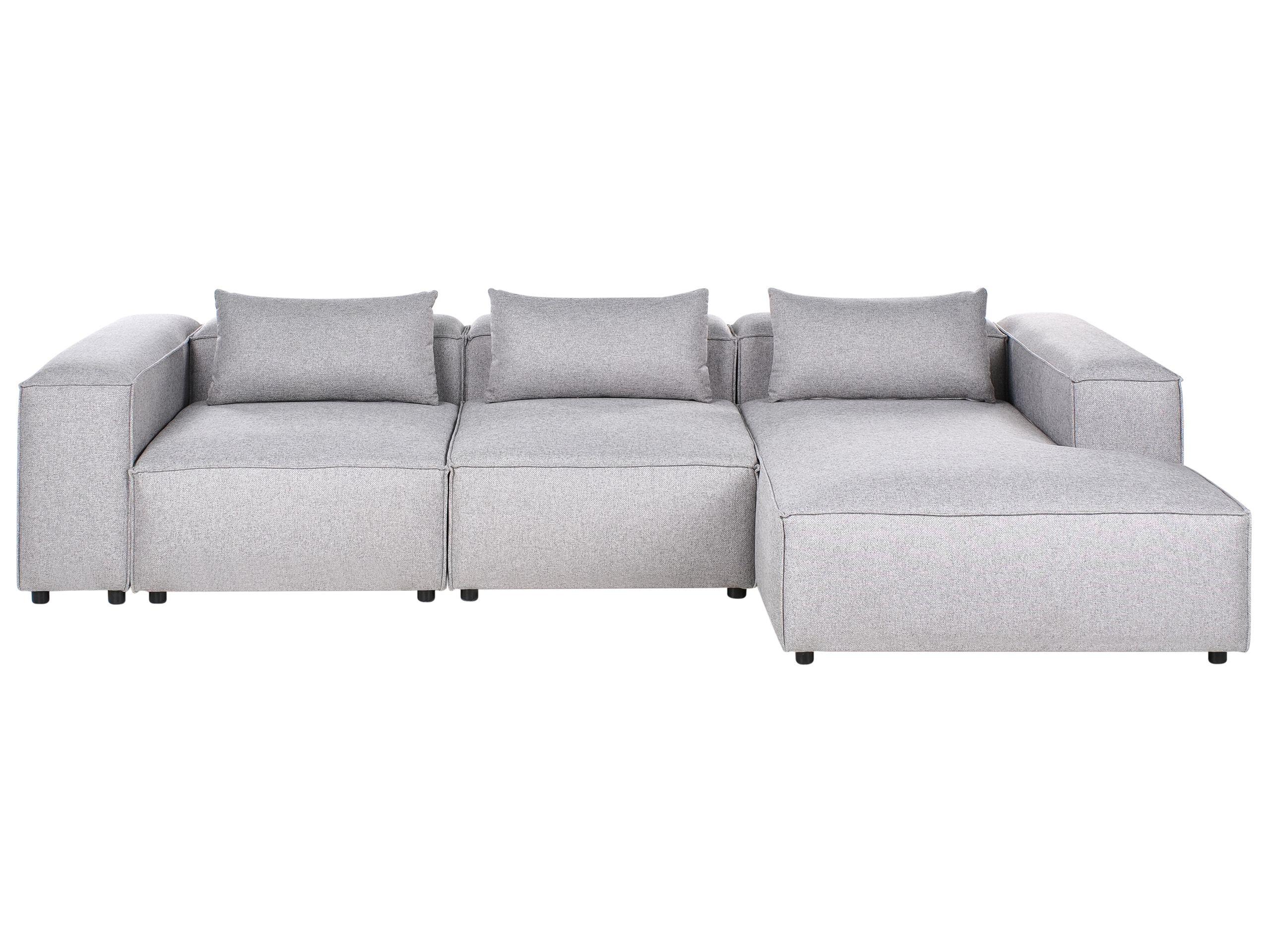 Modernes, modulares Viersitzer Ecksofa mit drei Dekokissen. Dieses Polstersofa zeichnet sich durch seine flexible Bauweise aus: Es lässt sich auf drei einzelne, freistehende Module aufteilen oder mit zusätzlichen Modulen erweitern – perfekt für dynamische Wohnkonzepte und -situationen. Der Stoffbezug ist mit auffälligen Ziernähten vollendet, die für eine moderne, hochwertige Optik sorgen und auch die klare Linienführung des Sofas unterstreichen. Dank der dicken Polsterung und niedrigen Sitzhöhe entsteht eine Lounge-Atmosphäre, die perfekt zu modernen Wohnräumen passt. Die Dekokissen mit abnehmbaren Bezügen und die integrierte Chaiselongue bilden weitere praktische Extras.