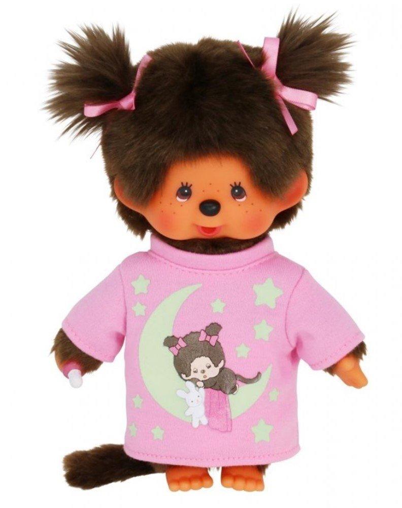 Monchhichi, Sekiguchi 223732 Original Mädchen, aus em Plüsch, mit rosa Schlafshirt, Glow in The Dark Elementen und Zöpfen mit Schleifen, ca. 20 cm groß