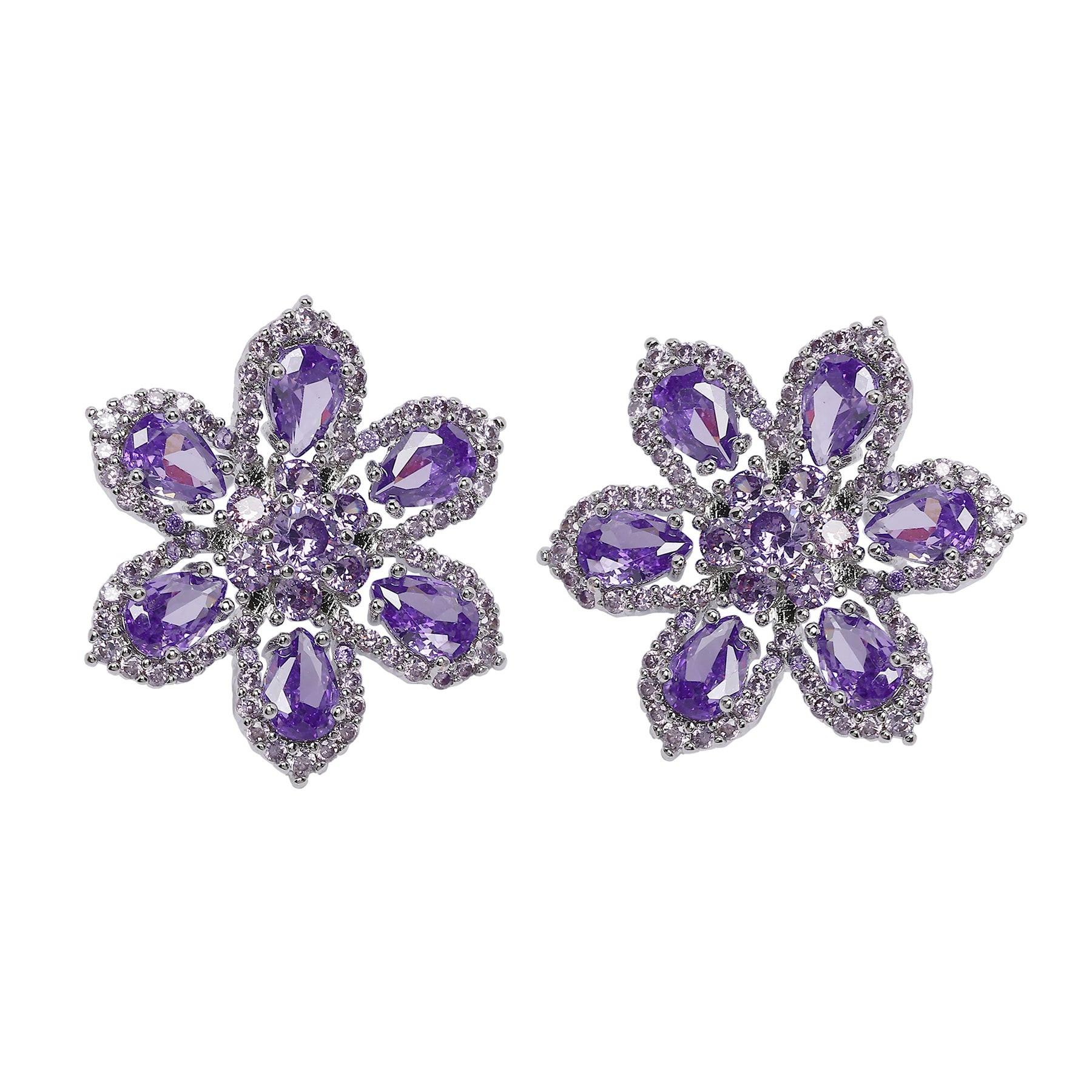 Ein Hauch von violetter Magie! Das filigrane Blumenmuster, verziert mit funkelnden Steinen, verströmt eine bezaubernde und anmutige Anziehungskraft, die alle Blicke auf sich zieht. Diese Ohrringe sind wie kleine Sterne für Ihre Ohren und verleihen jedem Outfit einen Hauch himmlischen Charmes. Größe: 2,2 cm x 2,5 cm | Beschichtung: Rhodiumplattiert | Verschluss: Stecker und Rückseite