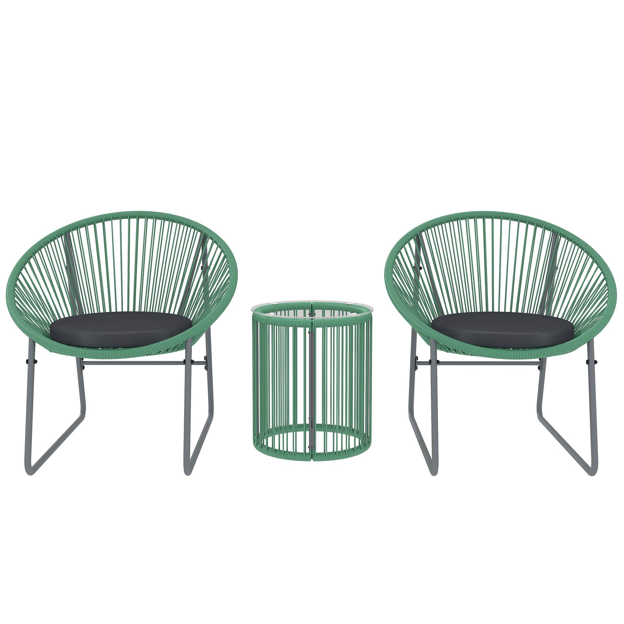 Beleben Sie Ihren Außenbereich mit dem charmanten Outsunny wetterfest Rattan-Gartenmöbel-Set, perfekt für kleine Räume geeignet. Das Möbelset umfasst zwei Acapulco-Stühle und einen zylindrischen Tisch mit Glasoberfläche. Die pulverbeschichteten Stahlrahmen sorgen für Stabilität. Dank der weichen Sitzkissen wird die Sitzlounge für Balkon zum idealen Ort für gesellige Stunden und entspannte Abende im Freien.
