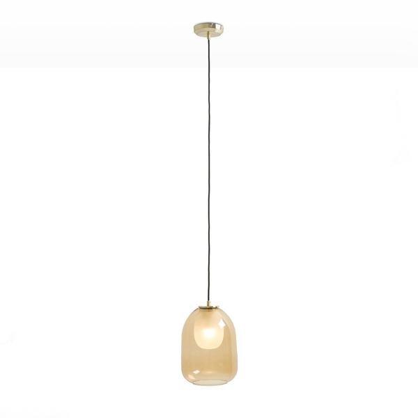 Die Hängeleuchte Bumble spielt mit einem schönen Materialmix aus gebürstetem Messing und bernsteinfarbenem Glas. Die Lampe setzt einen stilvollen Deko-Akzent und schafft eine warme Atmosphäre.