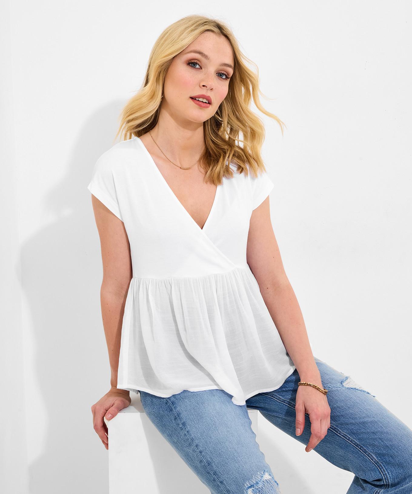 Dieses lockere V-Ausschnitt Top verfügt über ein schmeichelhaftes Wickeloberteil und einen gerafften Schösschensaum, der eine entspannte und dennoch stilvolle Silhouette schafft. Die kurzen Ärmel runden das bequeme Design ab und machen es zu einer vielseitigen Ergänzung für jede Garderobe.