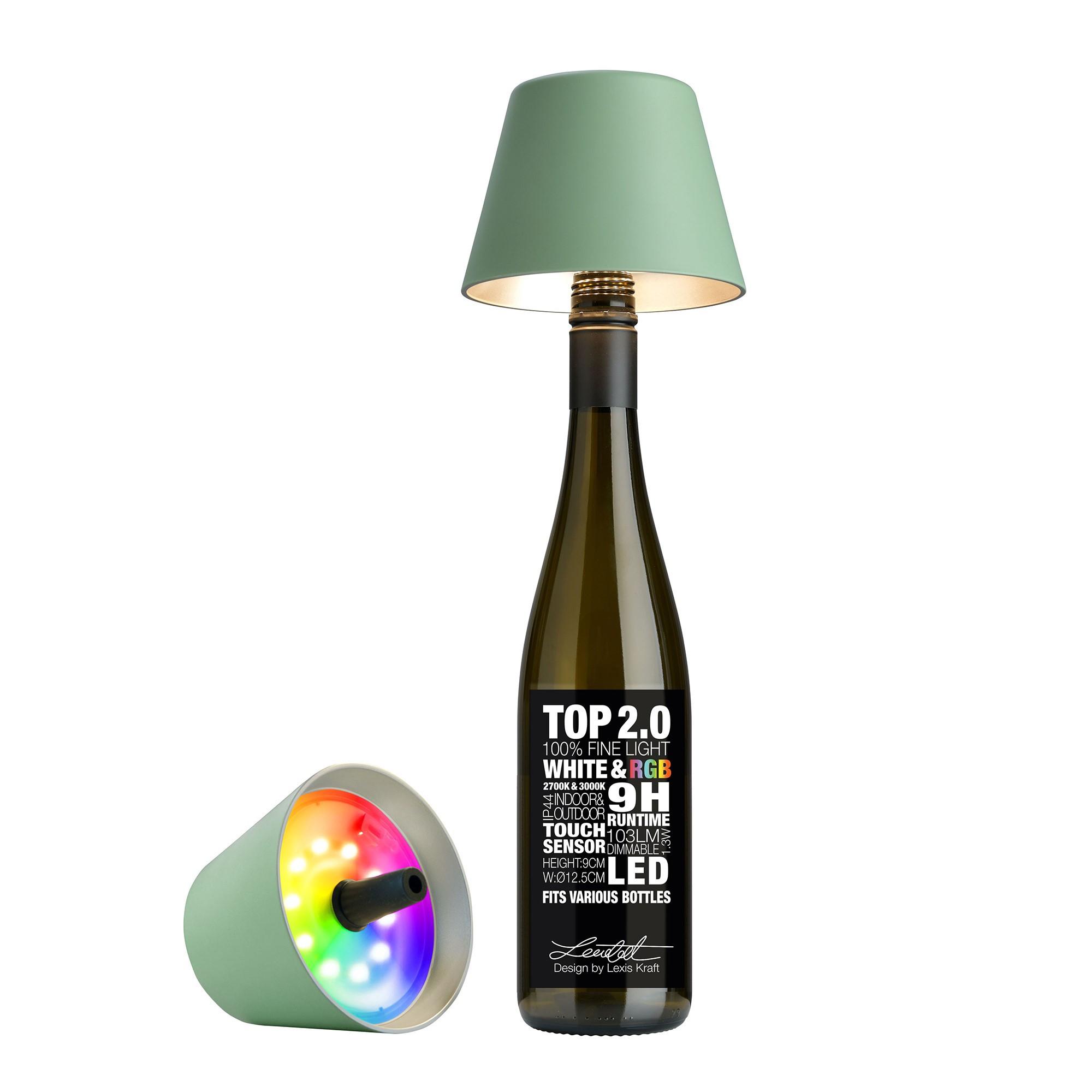 Akku Leuchte Top 2.0 von Sompex, verwandelt fast jede leere Flasche in eine Tischleuchte.Erhältlich in diversen FarbenLeuchte mit Silikon-Stopf passt auf fast alle FlaschenSilikon-Stopfen ist lebensmittelecht, kann also auf leeren und vollen Flaschen genutzt werdenDank Dimmer immer die perfekte StimmungIP44: Somit ist die Top indoor und outdoor zu verwenden9 Stunden LaufzeitWarmweisses oder kaltweisses Licht12 RGB-FarbenEdle Verpackung, wie man sie sonst nur von edlen Flaschen kennt.Durchmesser 12,5 cmDas Design ist europaweit patentiertDesigned by Lexis Kraft*Alle Flaschen dienen ausschliesslich der Veranschaulichung und sind nicht Teil des Lieferumfangs.Sie verwahren eine Champagnerflasche als Erinnerung an einen runden Geburtstag oder eine simple Bierflasche, weil sie bei einer unvergesslichen Feier geleert wurde? Dieses Altglas kann jetzt zu einem ganz besonderen Lichtobjekt werden mit der Flaschenleuchte TOP 2.0 von Sompex! Ihr Silikon-Stopfen passt mit seiner konischen Form in verschiedene Flaschenhälse so lässt sich im Handumdrehen eine stylische Beleuchtung mit einzigartigem Look zaubern. Werden Sie Ihr eigener Designer, entscheiden Sie sich für Upcycling in seiner besten Form! Die dimmbare TOP 2.0 läuft mit Akkubetrieb und spendet sowohl drinnen als auch draussen bis zu 40 Stunden Licht. Die TOP 2.0 gibt es in verschiedenen Farben und kommt in einer hübschen Rundverpackung, wie man sie sonst nur von edlen Flaschen kennt ein perfektes Geschenk. Über den Touch-Sensor im Kunststoffschirm lassen sich drei verschiedene Licht-Modi auswählen: 1. Farbtemperatur (Auswahl): In diesem Modus können Sie zwischen den warmweissen Farbtemperaturen 2700K und 3000 K wählen. Nachdem die gewünschte Farbtemperatur gespeichert wurde, kann die Leuchtkraft über den Touch-Sensor reguliert werden. 2. Farbiges Licht (Auswahl): In diesem Modus wählen Sie aus 12 Lichtfarben ihren Favoriten. Folgende RGB-Farben stehen Ihnen zur Auswahl: Rot, Rot-Magenta, Magenta, Blau-Magenta, Blau, Cyan-Blau, Cyan, Cyan-Grün, Grün-Gelb, Gelb, Orange 3. Farbiges Licht (12-Minuten-Automatik): In diesem Modus werden alle 12 RGB-Farben in einem zwölfminütigen Farbwechsel automatisch abgespielt. Der Farbwechsel ist stufenlos und bietet durch die seichten Übergänge (ca. 30 Sekunden) ein angenehmes und zugleich abwechslungsreiches Ambiente. Mit Memory-Funktion: Bei der TOP 2.0 Flaschenleuchte werden Farbmodus und Helligkeit gespeichert. So starten Sie bei der TOP 2.0 ganz komfortabel mit den von Ihnen gewünschten Einstellungen.Die TOP kommt in einer hübschen Rundverpackung, wie man sie sonst nur von edlen Flaschen kennt ein perfektes Geschenk. Video
