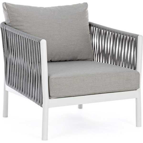 Gartensessel mit Gestell aus Aluminium, pulverbeschichtet (Polyester). Geflecht aus Tetoron-Schnüren (100% Polyester). Sitzkissen und Rückenkissen mit abziehbarem Bezug aus Olefin (100% Polypropylen).