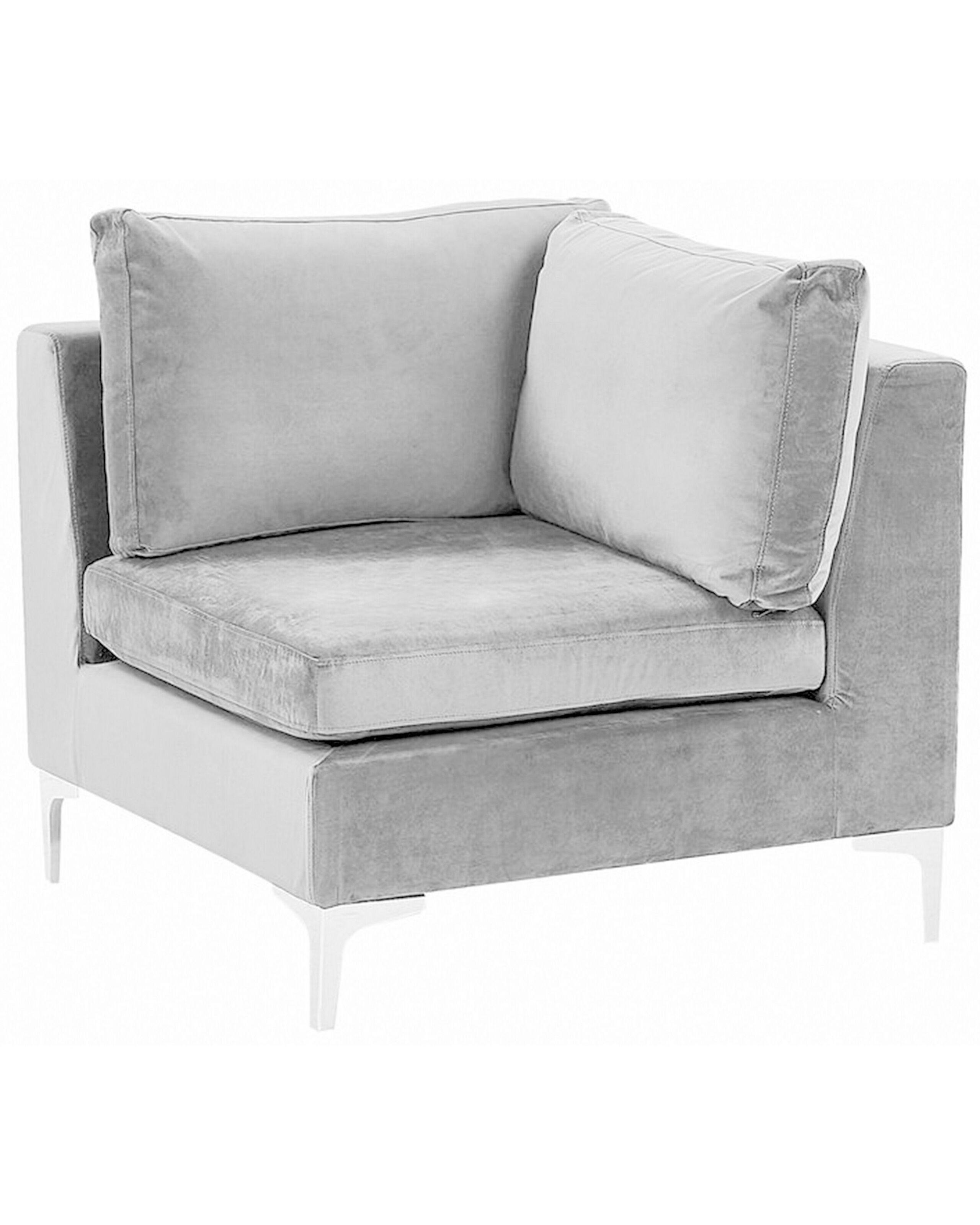 Klassisches Eckelement im trendigen Grau. Ob als selbstständiges Möbelstück oder als ein Modulelement eines Ecksofas oder einer grösseren Wohnlandschaft – dieses Eckteil ist einfach vielseitig einsetzbar. Es besitzt einen hochwertigen Rundumbezug aus Samtstoff, sowie abnehmbare Kissenbezüge, weshalb es auch für Familien mit Kleinkindern oder Tierliebhaber eine gute Wahl sein kann. Die trendige Farbgebung in Grau korrespondiert ausgezeichnet mit den verchromten Metallbeinen in Silberoptik, weshalb es äusserst modern, edel und einladend wirkt.