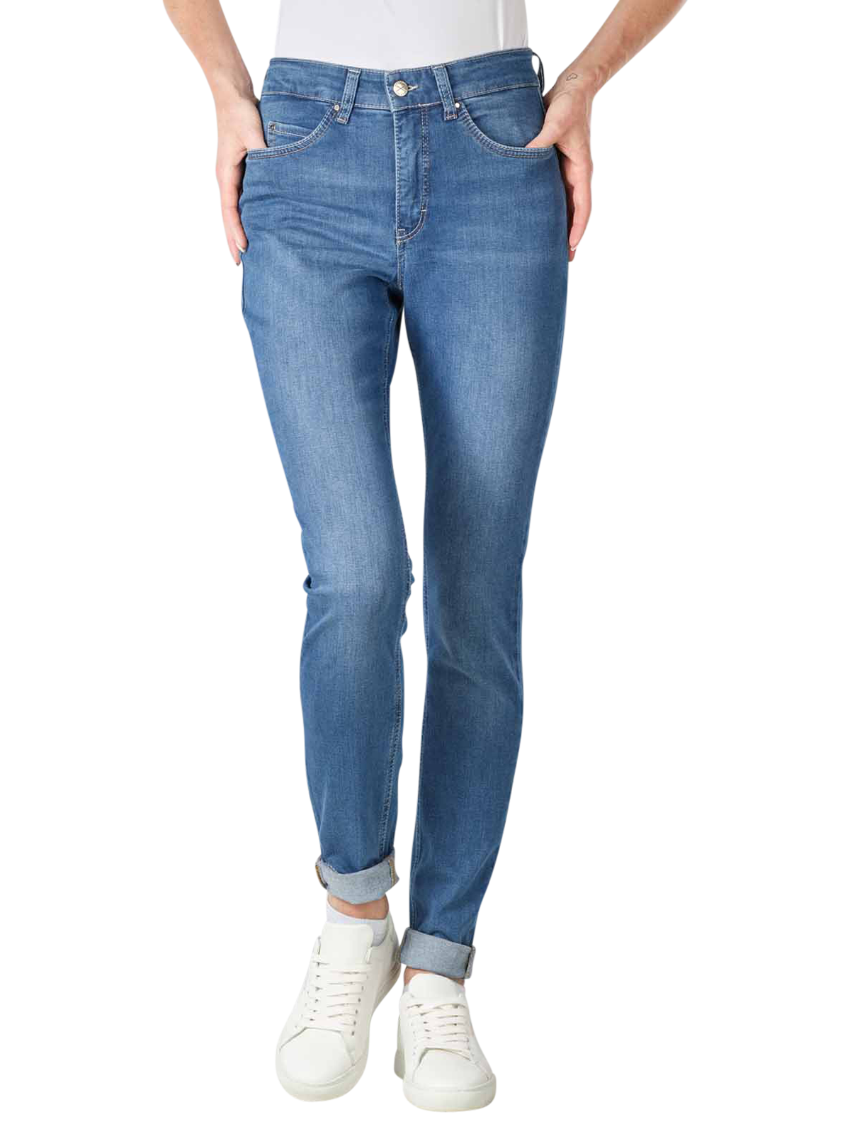 Die Dream von Mac im Stil Skinny Fit ist eine blaue Damenjeans. Sie betont durch ihren engen bis sehr engen Beinverlauf die Figur und hat eine mittlere Bundhöhe. Die Hosenbeine können lässig umgeschlagen getragen werden, was zusammen mit der dezenten Waschung für Aufmerksamkeit beim Betrachter sorgt. Das Stoffgemisch besteht aus recycelten Materialien, was die Jeans nicht nur zu einem stylischen, sondern auch zu einem nachhaltigen Kleidungsstück macht.