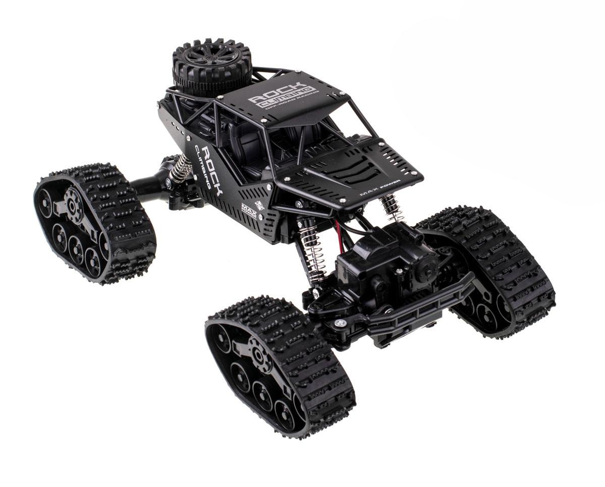 Ferngesteuertes RC ROCK Crawler Auto. Das aus Kunststoff mit Kunststoffelementen gefertigte Auto verfügt unter anderem über eine Federung und große rutschfeste Reifen. Steuerung erfolgt über eine 2,4-GHz-Fernbedienung.
