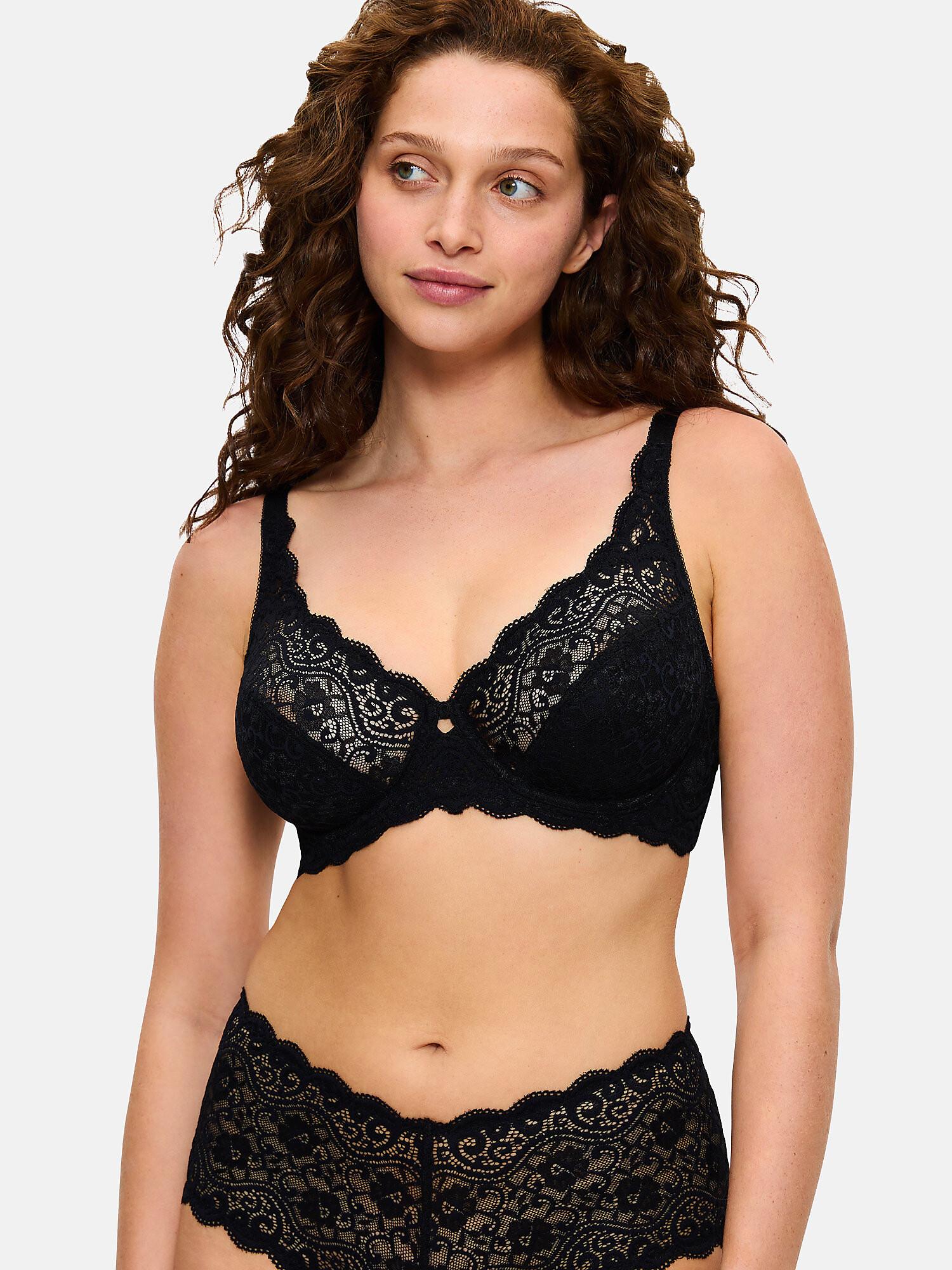 Der Amourette Bügel-BH aus der AMOURETTE-Kollektion präsentiert sich mit ikonischer floraler Spitze. Die ungepolsterten, halbtransparenten Cups bieten sanfte Unterstützung aus bequemem, dehnbarem Spitzenmaterial. Er verfügt über einen modernen, abgerundeten und zentrierten Schnitt mit V-Ringen und einem ausgeschnittenen Rücken. Der Haken- und Ösenverschluss sorgt für optimalen Halt und Anpassungsfähigkeit mit vier Weitenverstellungen. Verstellbare Träger gewährleisten optimalen Tragekomfort, und eine kleine Rose ziert den schmalen Godet.