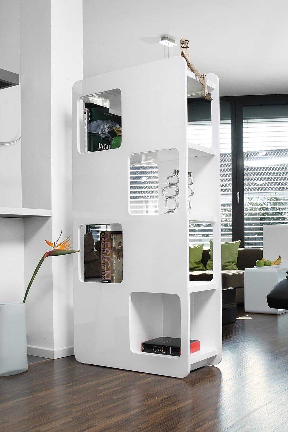 Die platzsparende Lösung für viel Stauraum. Der Raumteiler wurde aus MDF gefertigt und mit einer Hochglanz weissen Schicht lackiert. Das Regal verfügt über 4 Regalböden, welche grosszügigen Stauraum bieten. Sei es für Bücher, Akten oder Deko. Es können auch kleine Aufbewahrungskörbchen auf die Regalbretter gestellt werden, so sind die verstauten Dinge nicht sofort für jedermann sichtbar. Das Regal kann frei im Raum aufgestellt oder an eine Wand gestellt werden. Dank des modischen Designs passt dieser Raumtrenner in nahezu jedes Interior und findet im Wohn- oder Kinderzimmer, im Flur, im Büro oder im Schlafbereich seinen Platz. Das Standregal sieht nicht nur sehr schick aus, es erfüllt auch seinen Zweck.Weiss Hochglanz4 Regalböden8 offene Fächerfrei im Raum stellbarMasse der Öffnungen: 30x30 cmFachmasse: B30 x T32,4 x H33,6 cmfrei im Raum stellbarin Hochglanz weiss lackiertviel Stauraum für Bücher, Akten, Bilder etc.
