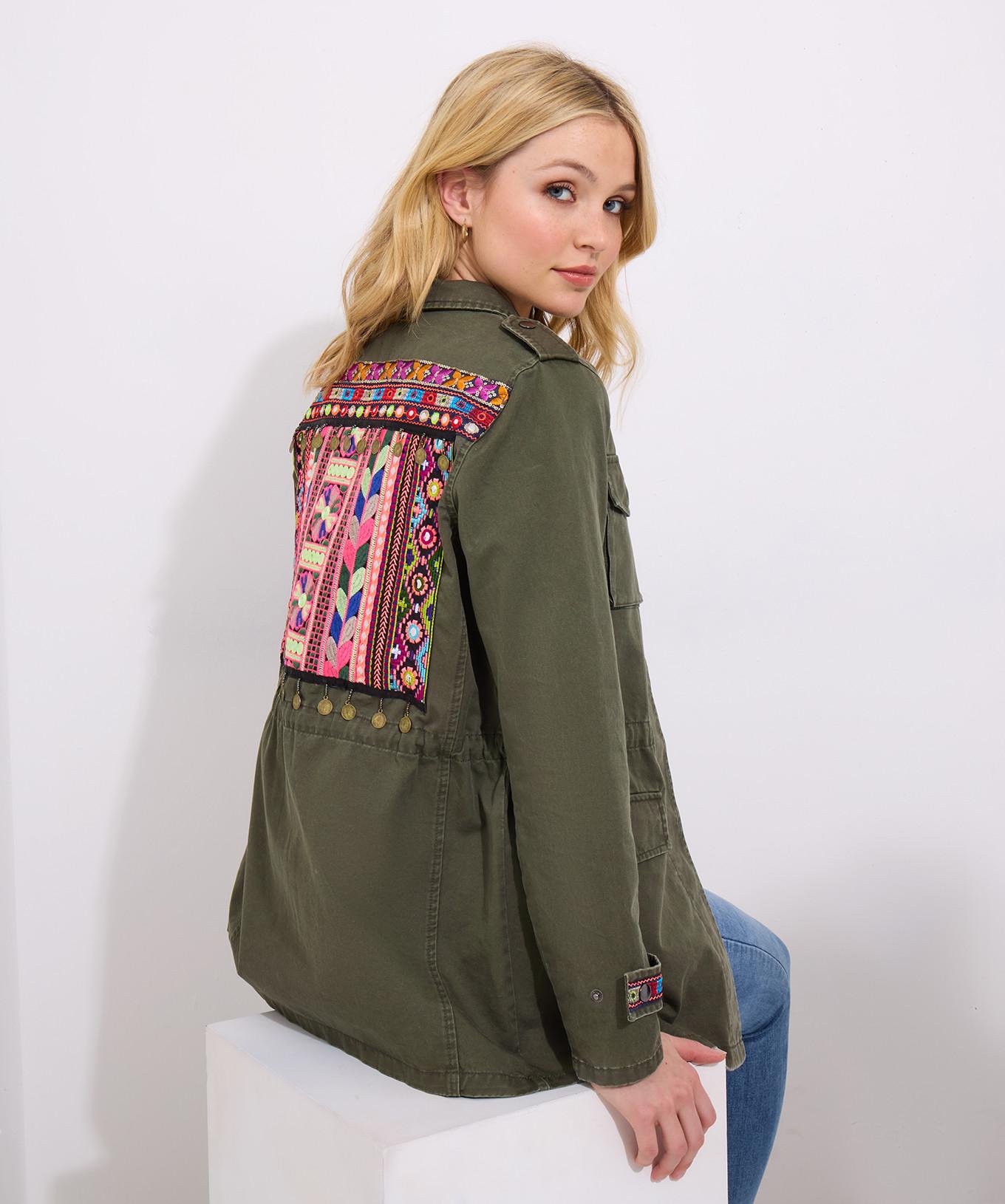 Diese bestickte Khaki-Jacke wurde entworfen, um ein Outfit in einen Statement-Stil zu verwandeln. Ihre Oversized-Passform sorgt für Komfort und Vielseitigkeit und macht sie zu einem geeigneten Lagenstück für verschiedene Anlässe.