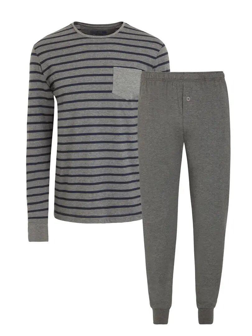 Dieses Pyjama-Set bietet Komfort und Stil für den Alltag. Das langärmelige Oberteil verfügt über ein klassisches Streifenmuster und eine praktische Brusttasche, während die Hose für eine entspannte Passform konzipiert ist, die Bewegungsfreiheit gewährleistet.