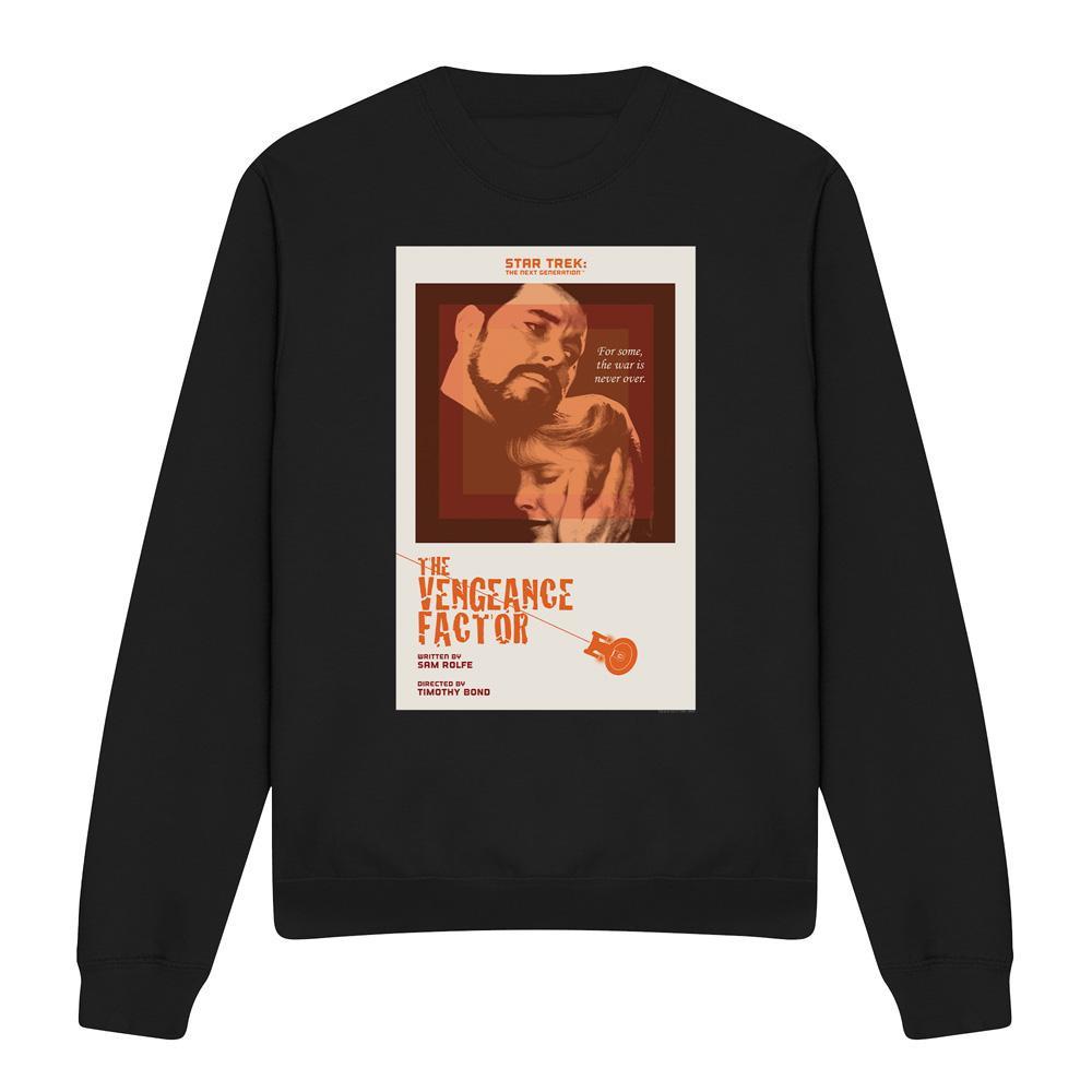 Dieses Sweatshirt verfügt über einen klassischen Rundhalsausschnitt und lange Ärmel und bietet eine bequeme und entspannte Passform. Die Vorderseite ist mit einem Grafikdruck versehen, der von "Star Trek: The Next Generation" Staffel 3 Episode 9 mit dem Titel "The Vengeance Factor" inspiriert ist. Das Design zeigt eine dramatische Szene mit Charakteren und Text und macht es zu einem unverwechselbaren Stück für Fans.