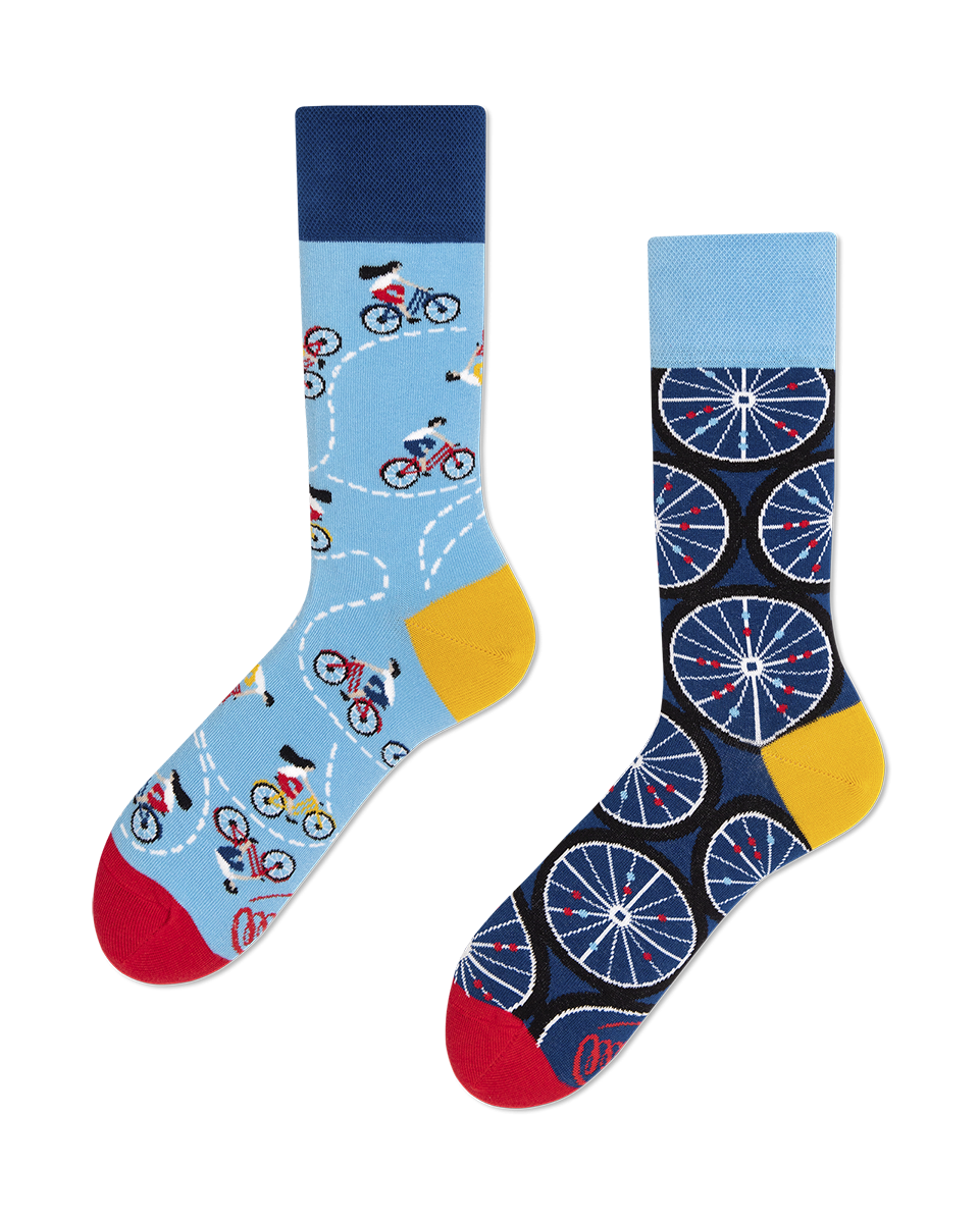 Diese verspielten Socken von Many Mornings präsentieren ein lebhaftes Fahrradthema, perfekt, um jedem Outfit einen Hauch von Spass zu verleihen. Eine Socke zeigt Radfahrer, die auf einem gestrichelten Weg auf hellblauem Hintergrund fahren, während die andere mit einem Muster aus Fahrradrädern auf dunkelblauem Hintergrund verziert ist. Beide Socken verfügen über kontrastierende gelbe Akzente an der Ferse und rote an der Spitze sowie gerippte Bündchen für einen bequemen Sitz.