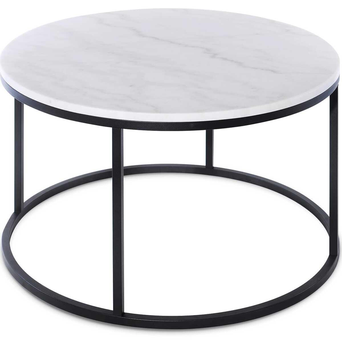 Couchtisch aus Marmor rund, Gestell Metall, Platte Marmor. Plattenstärke 18 mm, gerade Kante, Platte weiss, Gestell aus Metall schwarz, 85x85x48