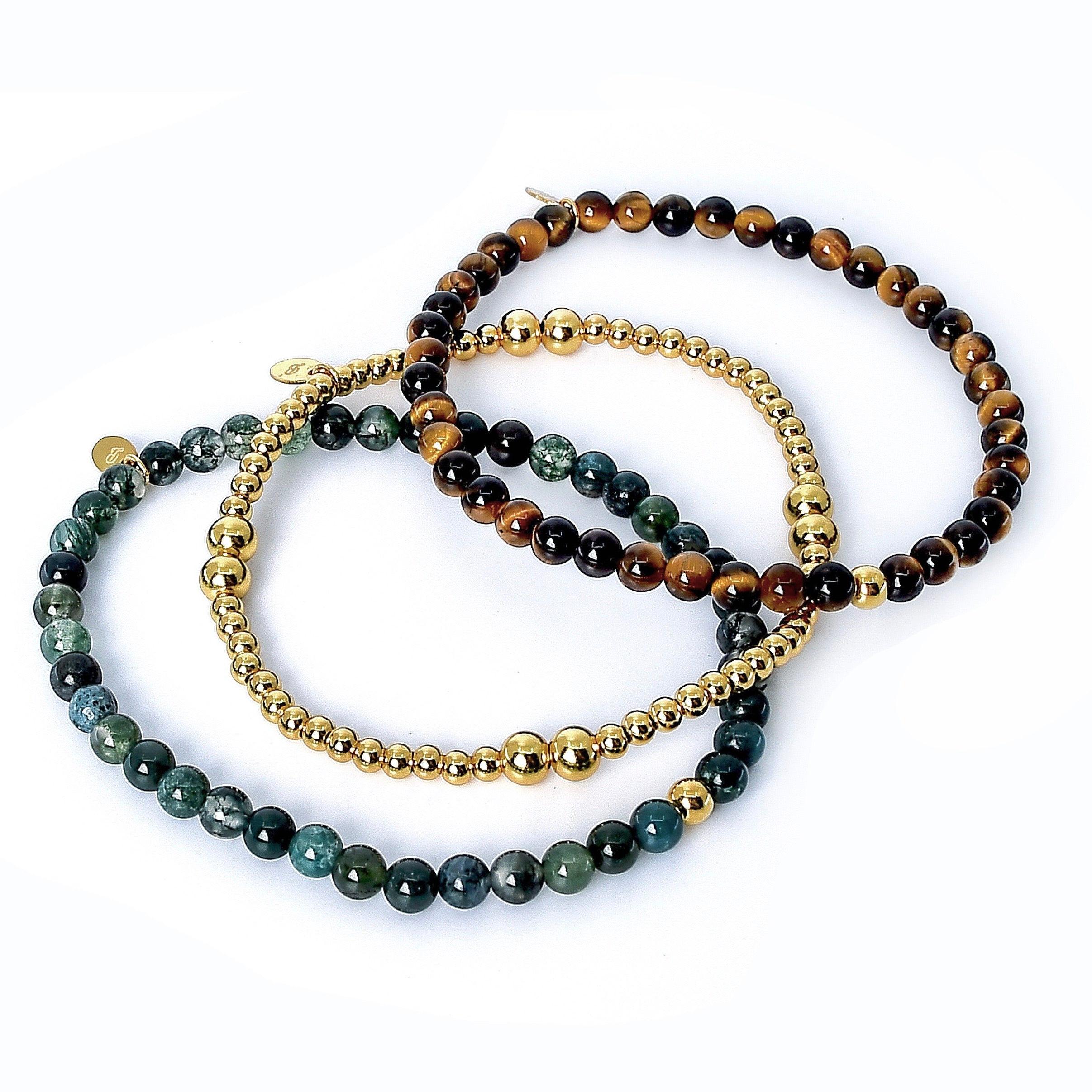 Dieses bezaubernde 3er Armband vereint die kraftvollen Energien von Achat, Moosachat und Tigeraugen mit dem edlen Glanz von vergoldetem 925 Sterling Silber. Jede Perle wurde sorgfältig ausgewählt und kunstvoll zu einem einzigartigen Ensemble kombiniert, das die Persönlichkeit jeder Frau unterstreicht.