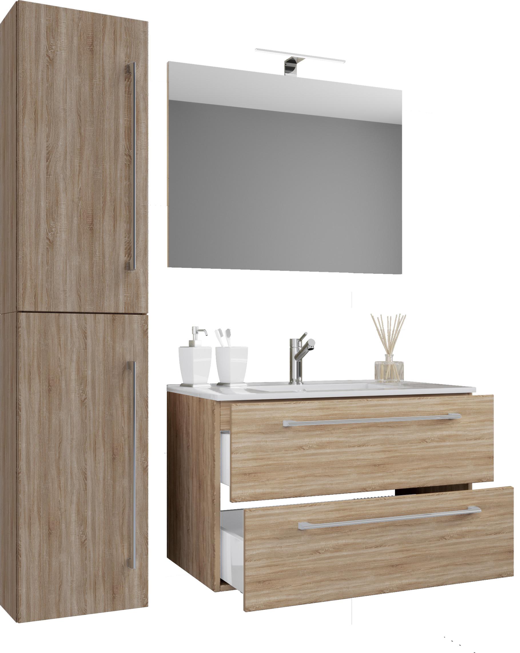 Das Badmöbel-Set "Badinos" besteht aus einem Unterschrank mit zwei Schubladen auf robusten Metallschienen, einem Hochschrank und einem Spiegel aus ESG-Sicherheitsglas. Das moderne Waschbecken aus massiver Keramik dient als Blickfang und verleiht Ihrem Badezimmer ein ganz besonderes Ambiente.