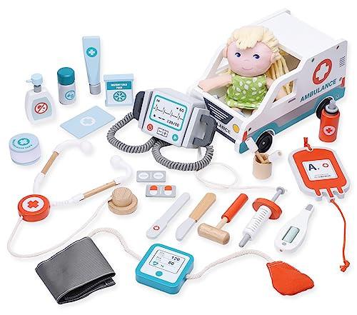 * Realistischer Holz-Arztkoffer für Kinder: das 22-teilige Arztkostüm Kinder-Arzt-Spielset mit Puppenfigur, Stethoskop, Krankenwagen, Blutdruckmessgerät, Defibrillator, Holzspritze, Pinzette, Pillen und Desinfektionsmittel sowie weiteren medizinischen Pflegeutensilien. * Hochwertiges Sicherheitsset: Der Arztkoffer für Kinder ist aus Naturholz, glattem Holz, robust und langlebig, umweltfreundliche Farbe, sicher für Kinder zum Spielen. Bietet maximale Sicherheit und bringt Kindern endlosen Spielspaß für Ihre Kinder. * Mehrzweck-Krankenwagen Der Arztkoffer aus Holz enthält einen lebensechten Krankenwagen mit einem Seil an der Vorderseite, an dem die Kinder ziehen können, um den Krankenwagen zu schieben, wodurch die Arbeit eines echten Krankenwagens simuliert wird. Er kann auch als Aufbewahrungsbox für alle Spielsachen verwendet werden, um Kindern zu helfen, gute Gewohnheiten zu entwickeln.