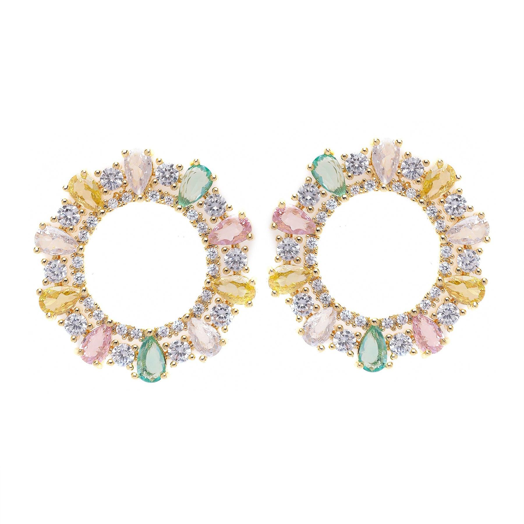 Diese farbenfrohen Creolen bestechen durch eine faszinierende Auswahl an bunten Steinen, eingefasst in eine schimmernde Goldfassung. Das Zusammenspiel von Grün-, Blau-, Rosa- und Gelbtönen erzeugt einen atemberaubenden Regenbogeneffekt und macht diese Ohrringe zu einem ausdrucksstarken und auffälligen Schmuckstück. Größe: 2,5 cm x 2,5 cm | Beschichtung: Vergoldet | Verschluss: Stecker und Rückseite